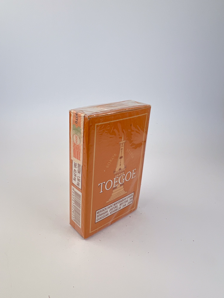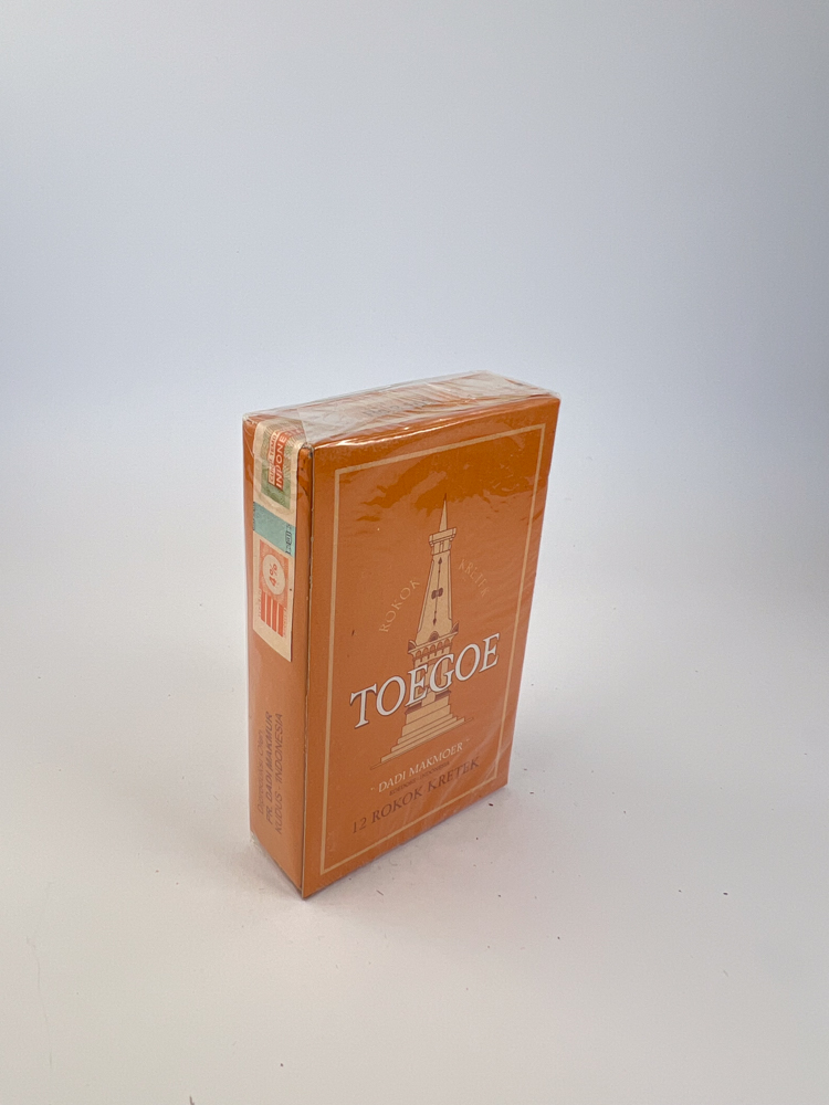 Šis „Toegoe“ pakelis yra ryškios oranžinės spalvos su aukso spalvos siluetu (galbūt monumento arba stulpelio motyvas) centre, virš užrašo „TOEGOE“. Apatiniame krašte užrašas: „12 Rokok Kretek – Made in Indonesia“. Šone – akcizo žymė su vertę „Rp 6.000“ ir vertikalus teksto stulpelis. Vyniojimas originalus, plėvelė nepažeista, pakelis atrodo neatidarytas. Dizainas gana minimalistinis, spalvų schema išskirtinė – oranžinė pagrindinė su auksiniais akcentais – tai suteikia pakeliui vizualinę charakterį.