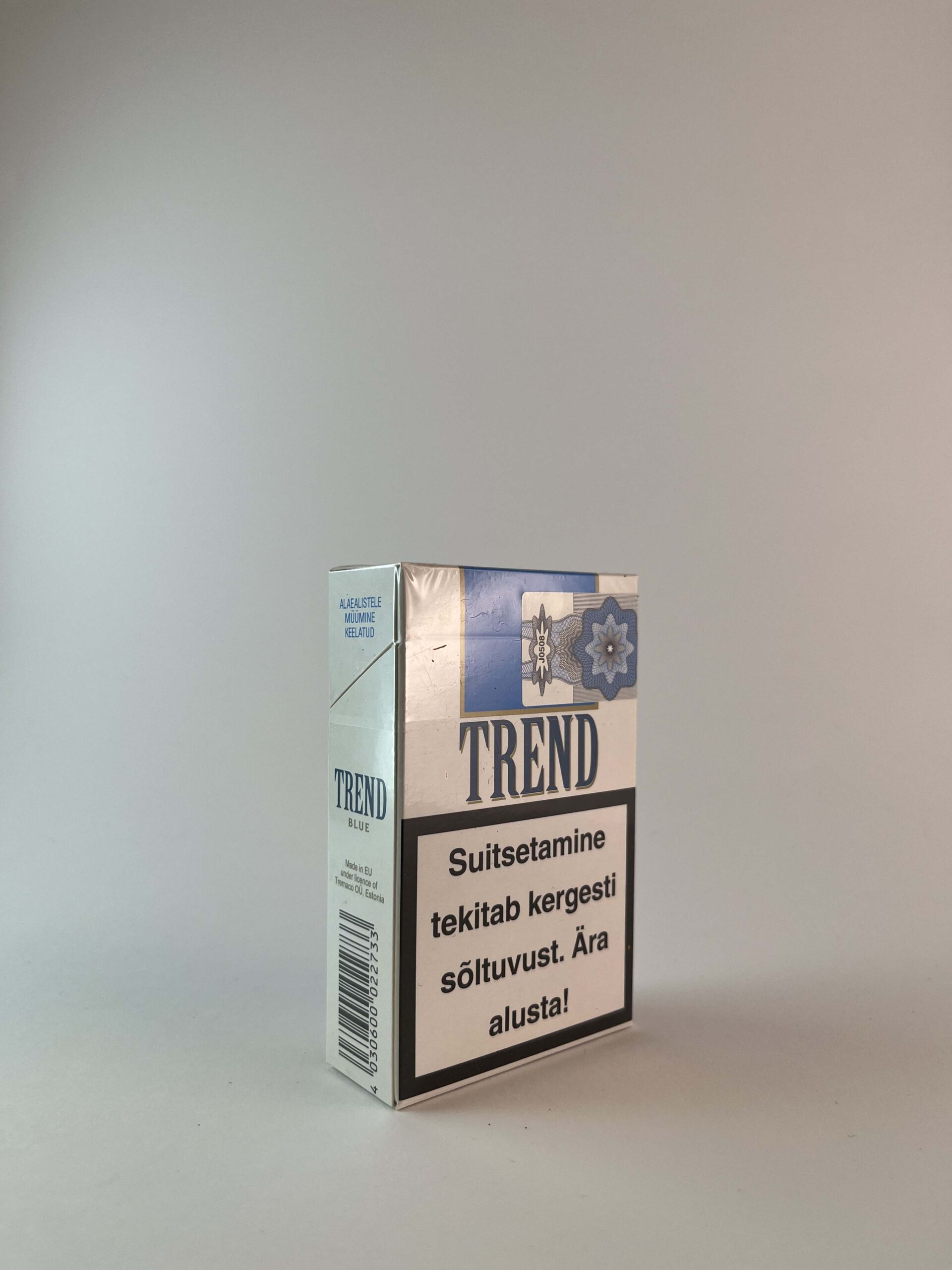 Description: The Trend Blue cigarette pack is modern and elegant, dominated by blue with minimalist details. The packaging emphasizes the quality of the product, along with warnings about the dangers of smoking. This edition is intended for the Estonian market, as evidenced by the production in Estonia and local information on the packaging.