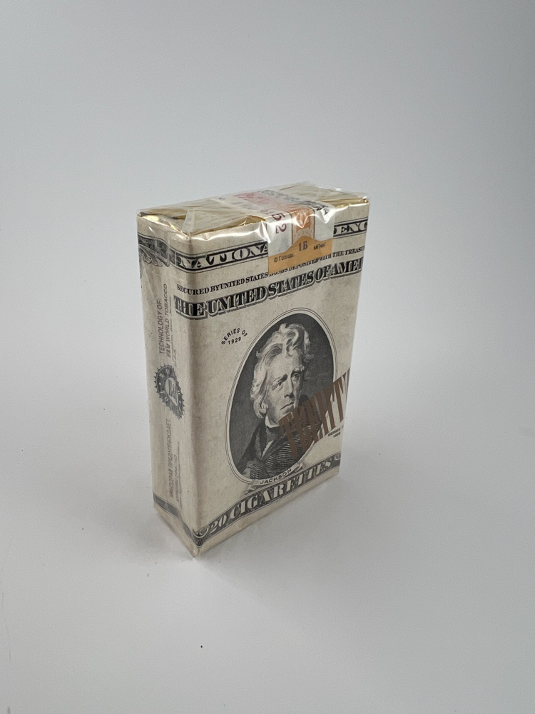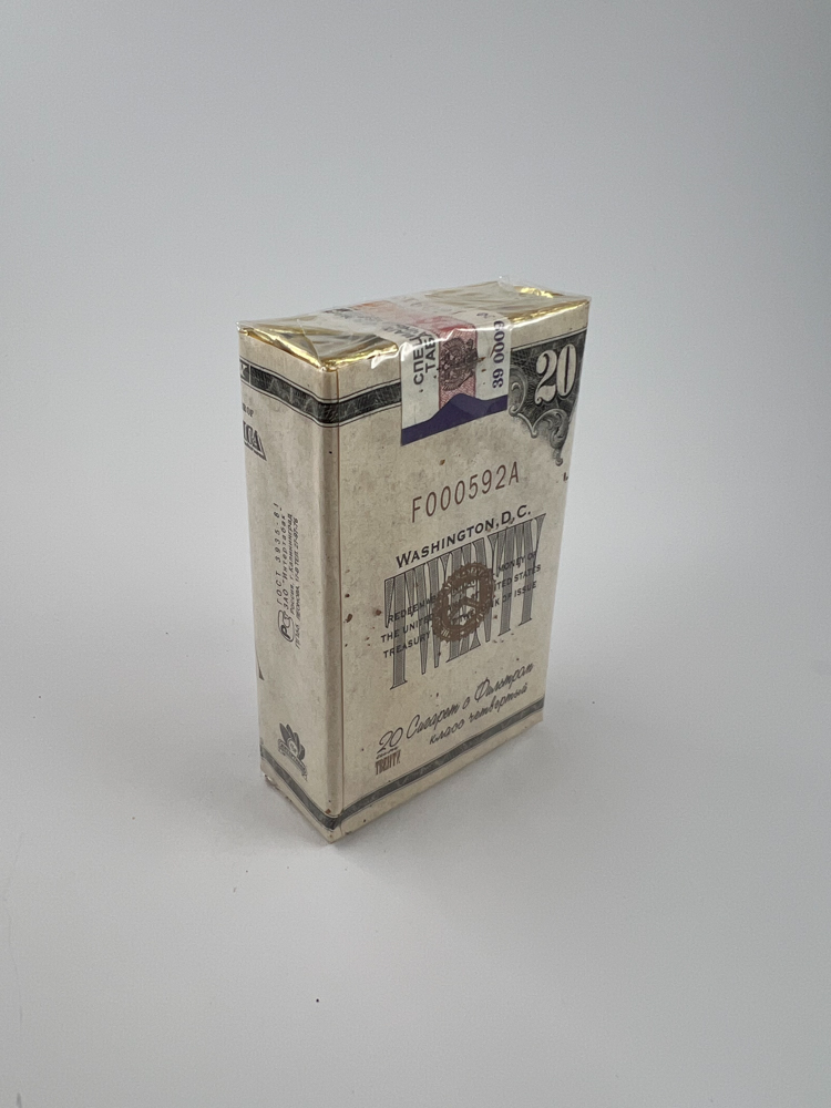 Šis TRINITY „TWENTY“ cigarečių pakelis yra išskirtinio dizaino – primenantis JAV 20 dolerių banknotą su Andrew Jackson portretu, serijos numeriu, spaudais ir stilizuotais užrašais, imituojančiais valiutą. Pagrindinė spalva – pilkšvai balta su tamsiais užrašais, o viršuje esantis rusiškas akcizo lipdukas patvirtina gamybą Rusijoje. Ant pakelio nugarėlės pateikta informacija apie gamintoją, įrašas „Washington, D.C.“ ir kita simbolika papildomai stiprina valiutos tematiką. Tokie dizainai buvo populiarūs 1990-aisiais, kai gamintojai eksperimentavo su vakarietiška simbolika. Pakelis nepažeistas, neišpakuotas, originalioje plėvelėje.