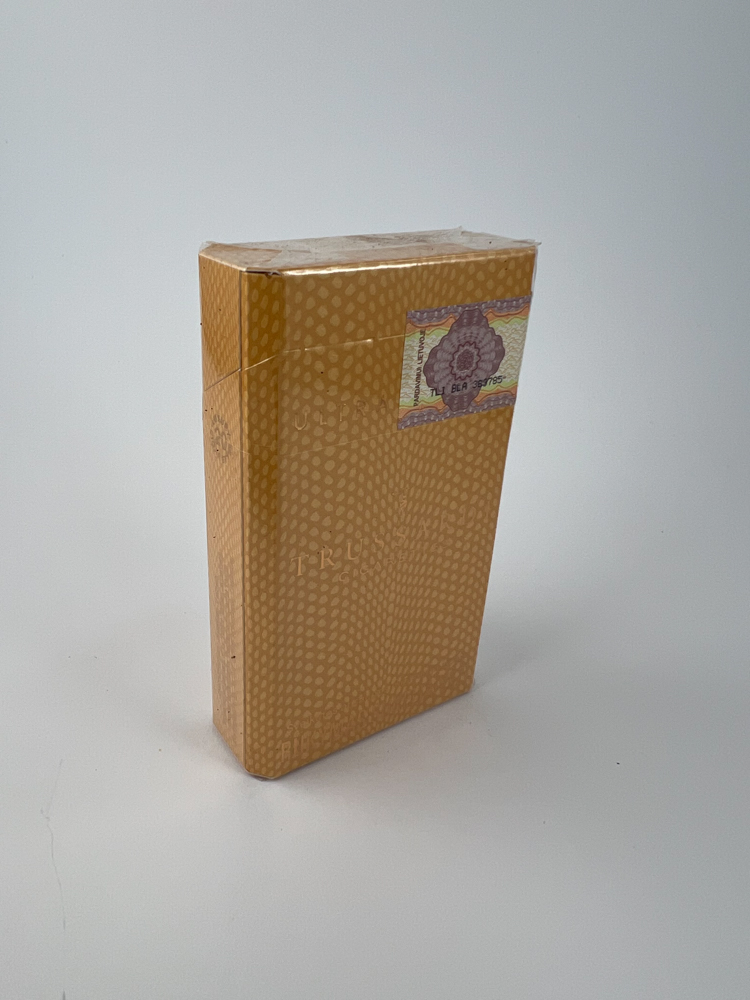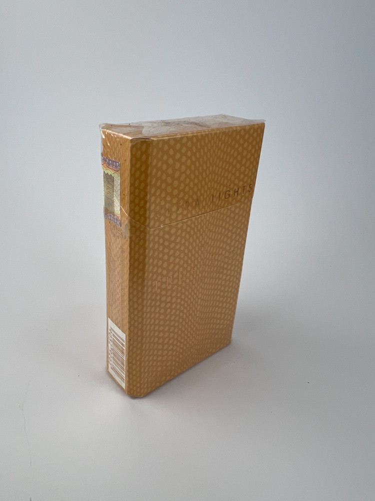 Description: True Ultra Lights 100's is a minimalist cigarette pack, typical of the last decade of the 20th century. The pack is light yellow in color with a dotted background, and the inscriptions ("TRUE", "ULTRA LIGHTS", "100's") are embossed, almost invisible at first glance. A federal excise stamp is visible on top. This pack belongs to the milder concentration category, oriented towards smokers looking for a lighter taste. Place of production - Austria.