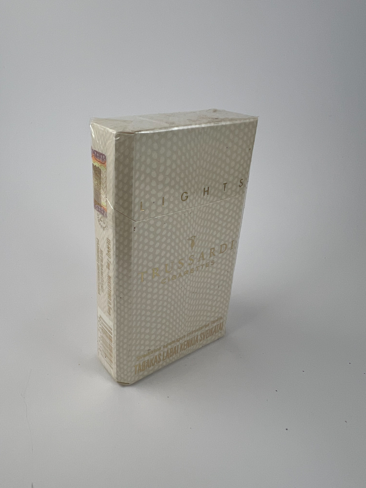 Description: Trussardi Lights is a cigarette pack with a bright, elegant design, produced under license from a well-known Italian fashion brand. The pack is decorated with a white-beige background with a dotted pattern, and the logo, text and information are embossed in gold letters. Warnings about the harm of smoking are presented in Lithuanian, and the original Lithuanian excise stamp is visible at the top, allowing you to identify the country of manufacture. The design is subtle and refined, reflecting the aesthetics characteristic of fashion brand lines.