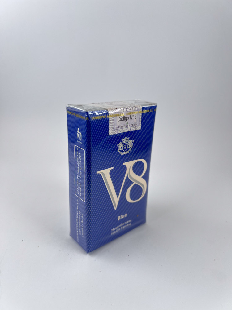 In the center – a large white logo „V8“, under it the inscription Blue.