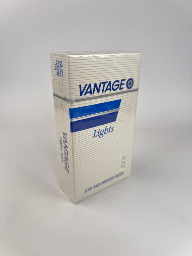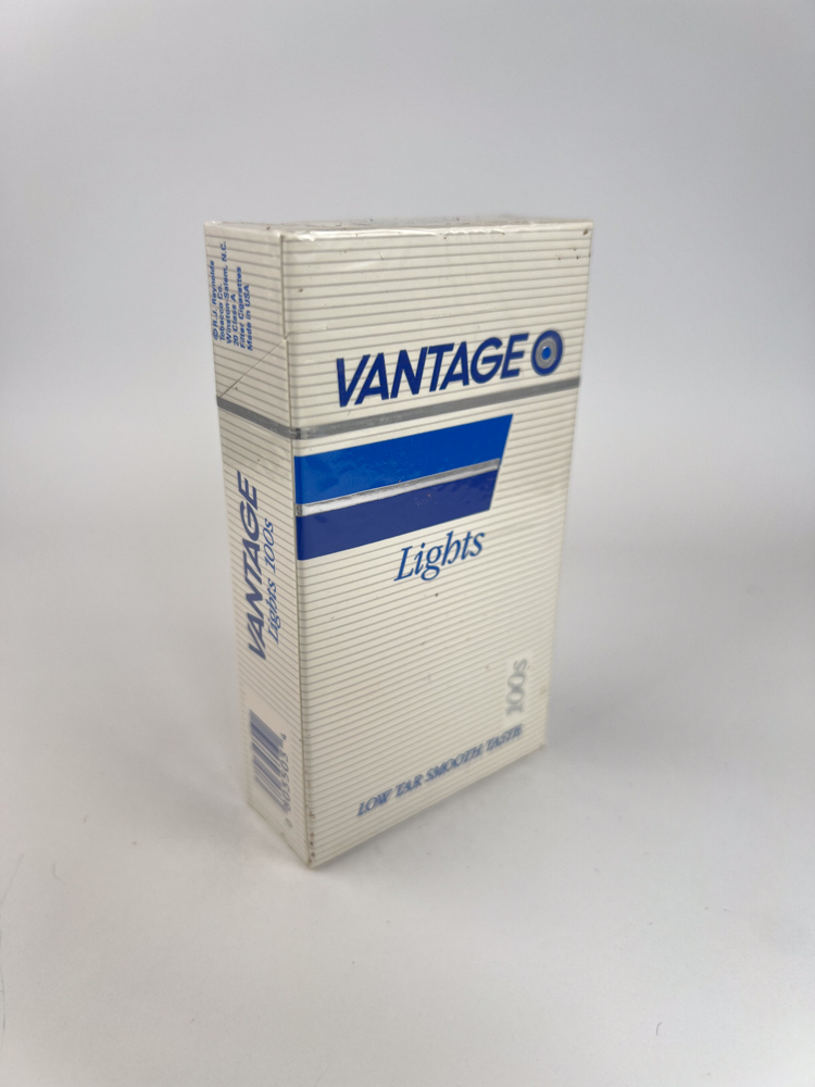 The white design, covered in horizontal lines, gives the package a clean and light feel, typical of the late 20th century "light" cigarette aesthetic. The bright blue rectangle in the center, divided by a silver stripe, and the inscription next to it VANTAGE Lights conveys a modern, precise graphic image. The name font is clear, sans-serif, and the blue color emphasizes the milder taste and lower tar content. At the bottom is the phrase "LOW TAR. SMOOTH TASTE." - a typical marketing slogan of that era, emphasizing mildness and a "healthier" image.