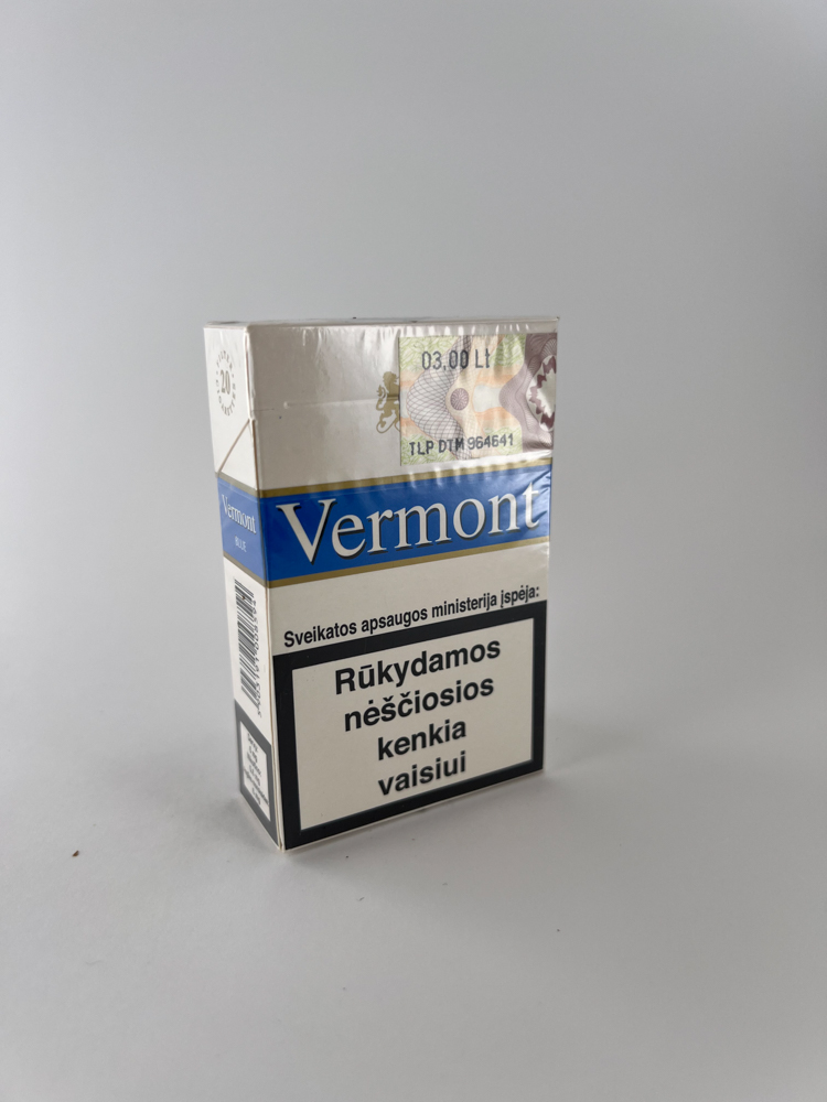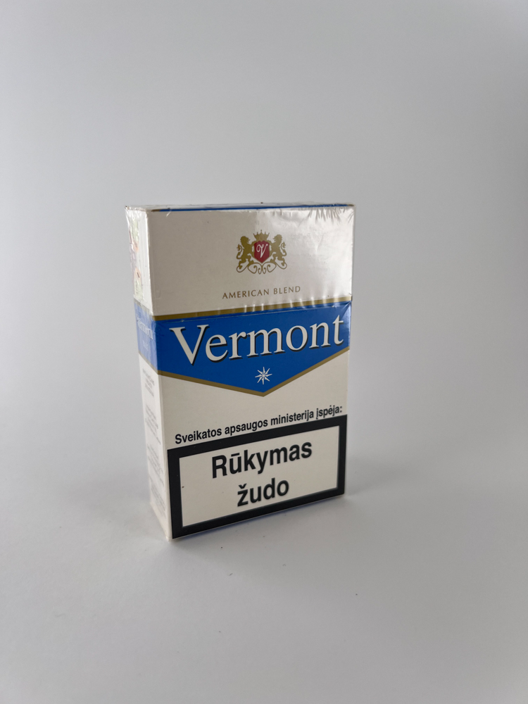 „Vermont Blue“ – tai biudžetinio segmento cigarečių pakelis, orientuotas į „American Blend“ tipo rūkalius. Klasikinis mėlynos spalvos dizainas su auksiniu kraštu bei herbo motyvu viršuje primena klasikinę vakarietišką estetiką. Sveikatos įspėjimai pateikti aiškiai lietuvių kalba. Kaina – 3,00 Lt – buvo žema net to meto kontekste, todėl šis pakelis įdomus kaip tipinis pavyzdys iš pigių cigarečių laikotarpio prieš ES reglamentų griežtinimą.