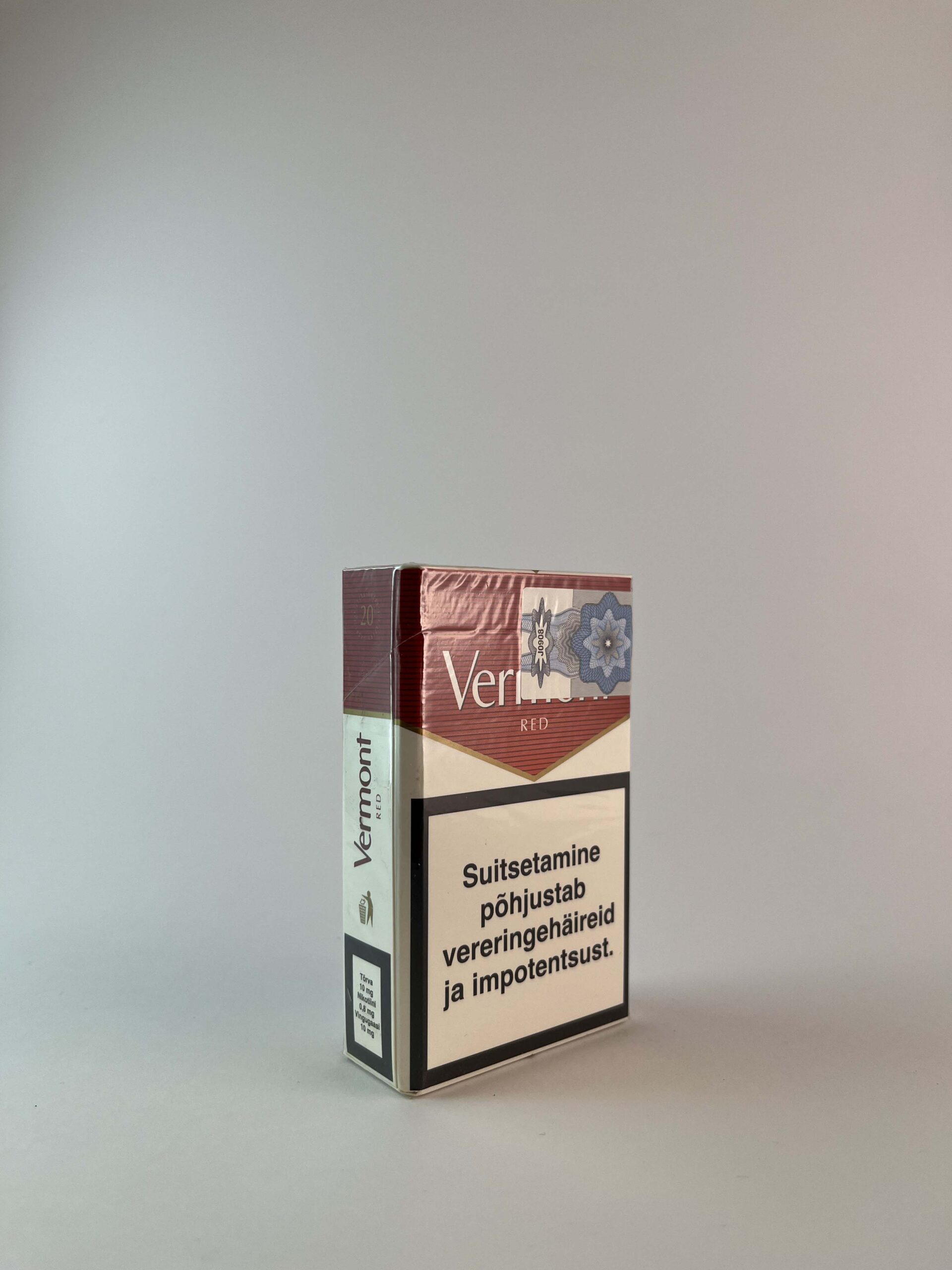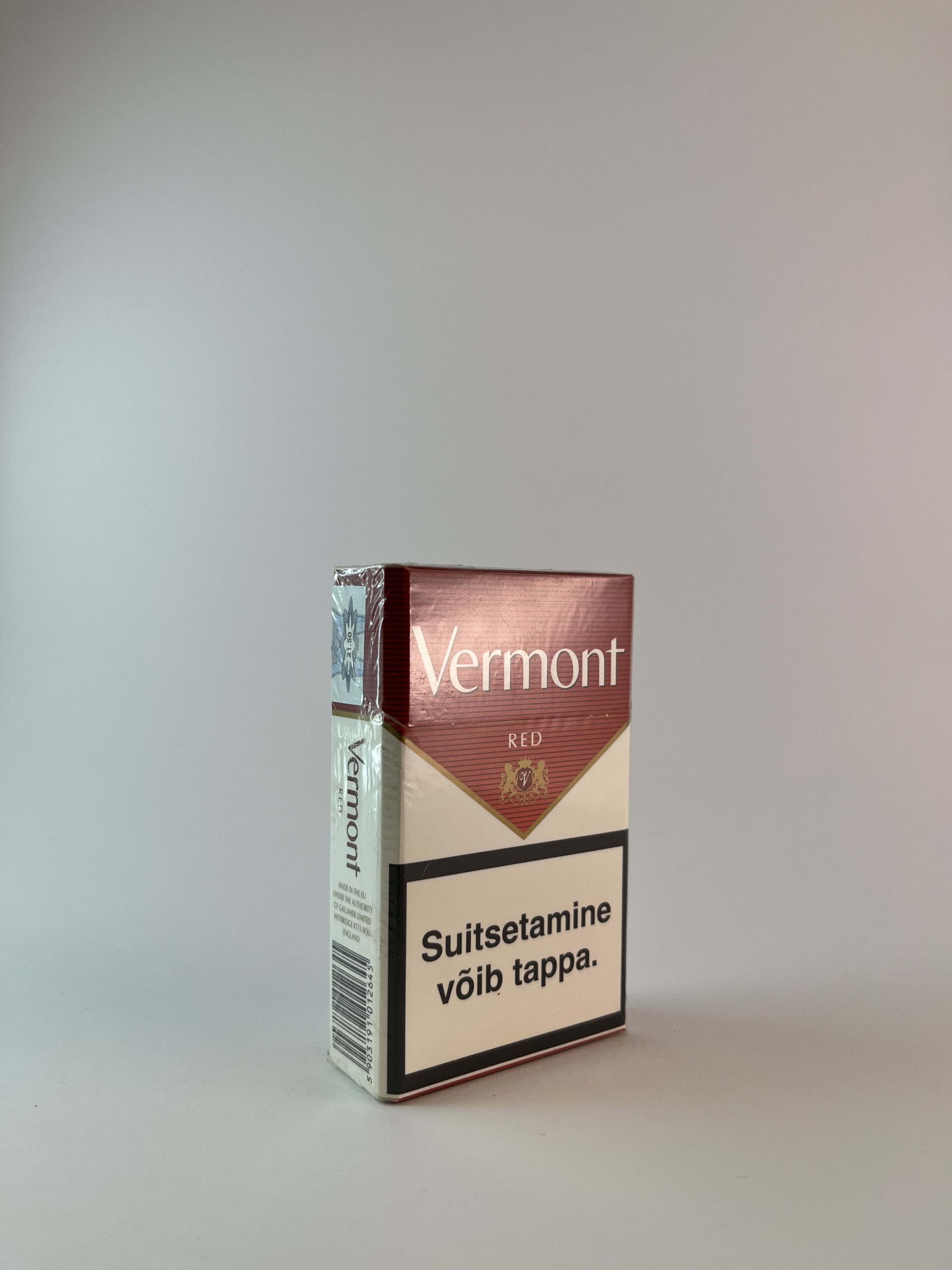 Description: Vermont "Red" is an elegantly designed cigarette pack, featuring a dark red color with gold accents. It is designed for those who appreciate the classic taste of an American blend. Warnings about the harms of smoking occupy a large part of the package design, in accordance with modern EU requirements.