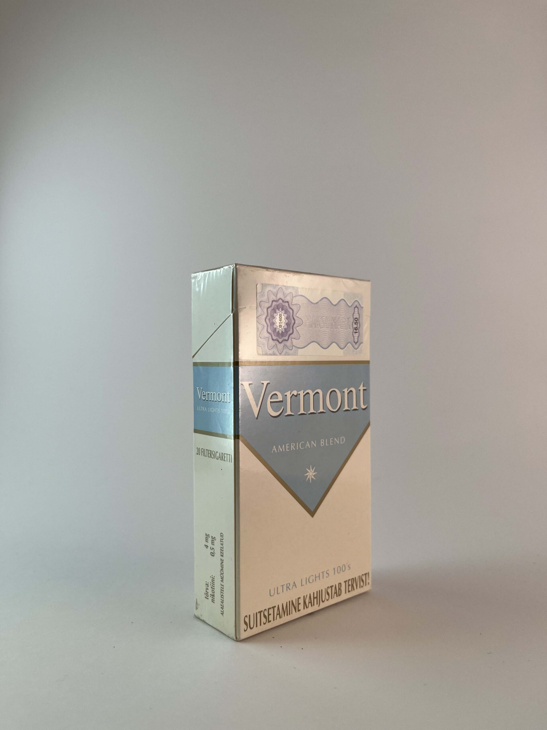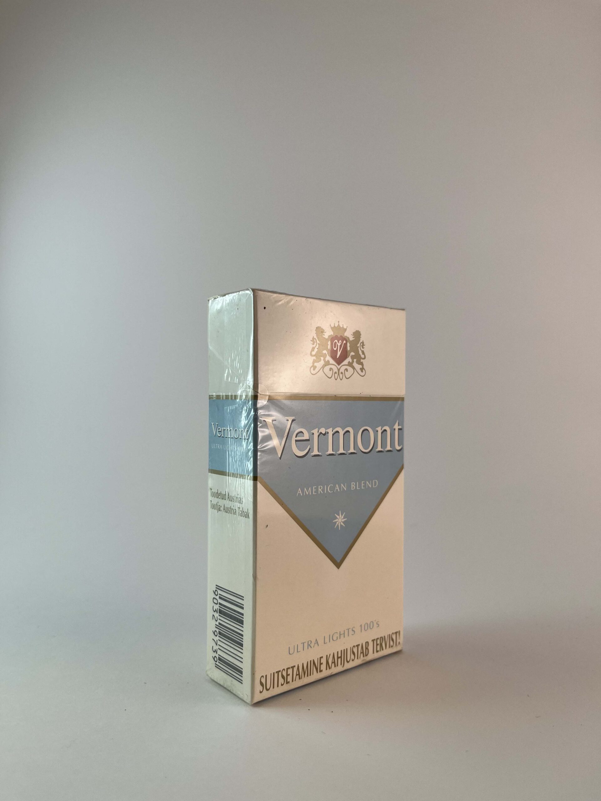„The Vermont Ultra Lights 100's cigarette pack features a modern design with light blue and white colors that add elegance. The front of the pack clearly displays the name and the warning about the harms of smoking. These are long cigarettes that are often associated with milder flavors. The Vermont brand is well-known in the Austrian market and appeals to lovers of minimalist style.