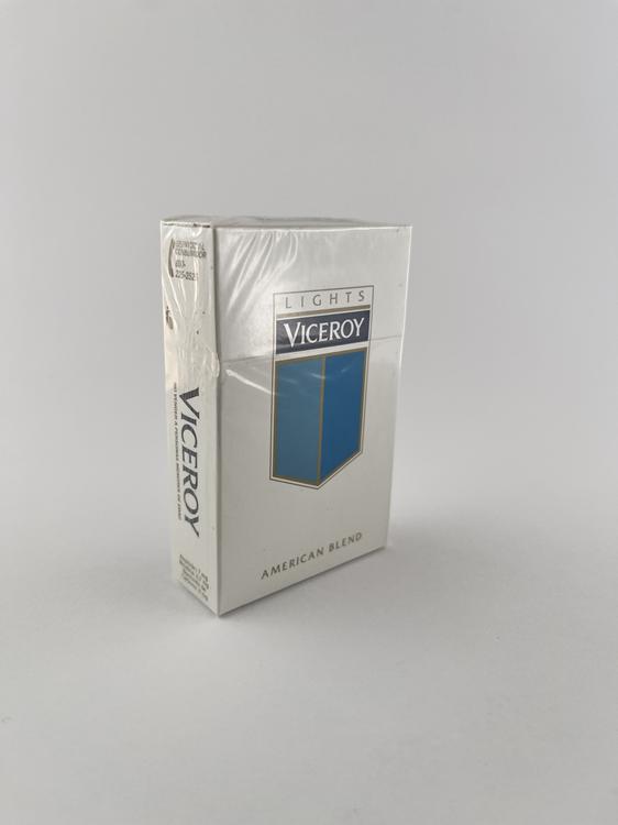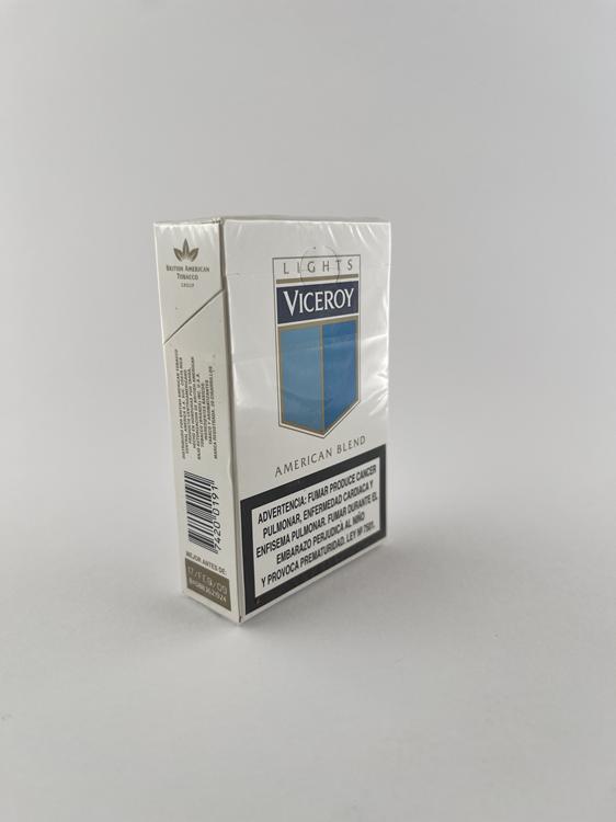 Aprašymas: Viceroy „Lights – American Blend“ cigarečių pakelis pasižymi švariu ir minimalistiniu dizainu, būdingu šiuolaikiniams tarptautiniams prekės ženklams. Dominuoja balta spalva su mėlynu skydo formos logotipu, kuris yra pagrindinis Viceroy vizualinis identitetas. Užrašas „Lights“ nurodo lengvesnę cigarečių versiją, o „American Blend“ – naudojamo tabako tipą. Ant šoninės dalies matomas „British American Tobacco“ ženklinimas, patvirtinantis gamintoją. Sveikatos įspėjimai pateikti ispanų kalba, kas rodo platinimą Ispanijos ar Lotynų Amerikos rinkoje. Dizainas modernus, orientuotas į masinę rinką, be kolekcinio ar riboto leidimo požymių.