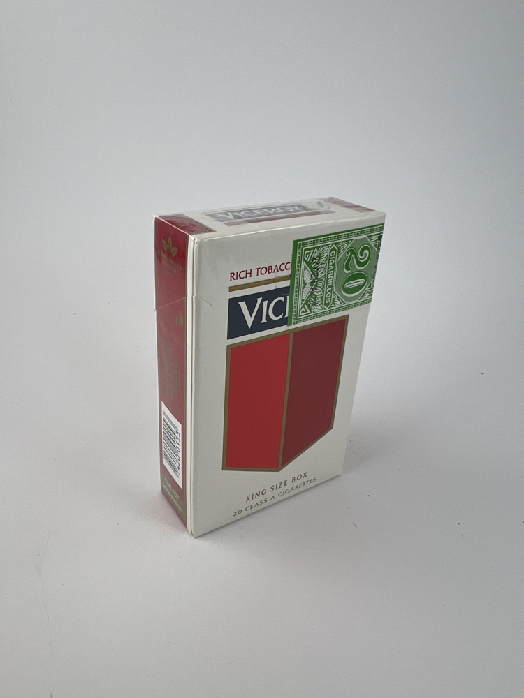 This Viceroy cigarette pack has a classic, modern design – a white background dominated by a red graphic element with gold outlines and a dark blue logo. The top is clearly marked with „Rich Tobaccos • Filter Kings“, and the bottom part – „King Size Box“ and „Rich Natural Tobaccos / 20 Class A Cigarettes“. The package has a US excise stamp, which allows you to confirm its origin. The pack is intact, tightly packed in the original film.