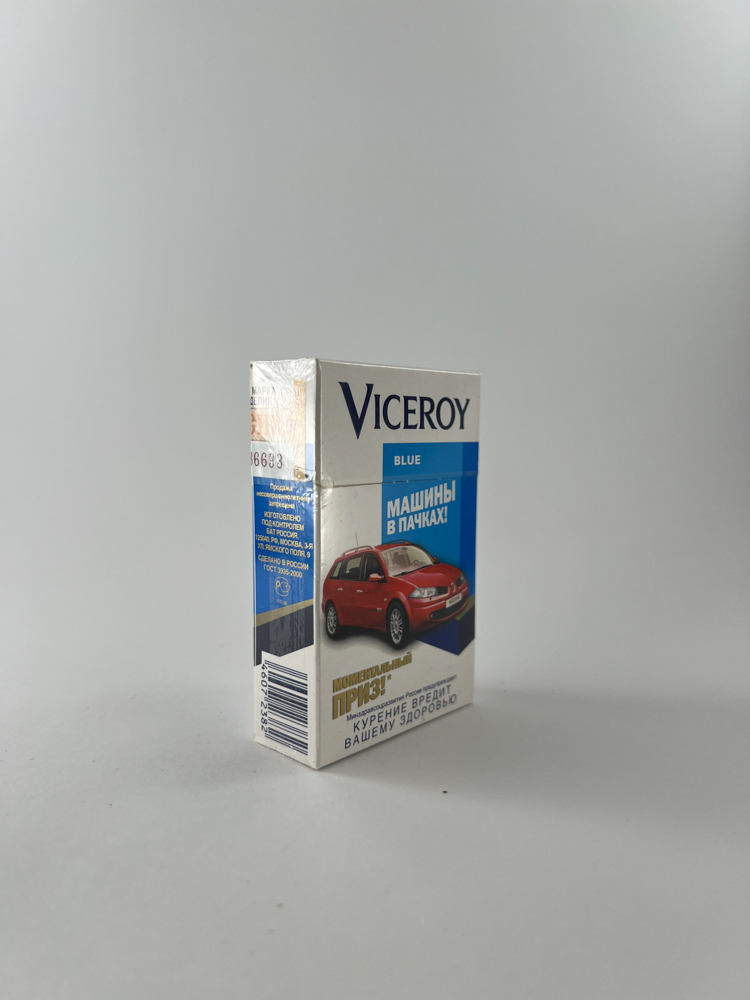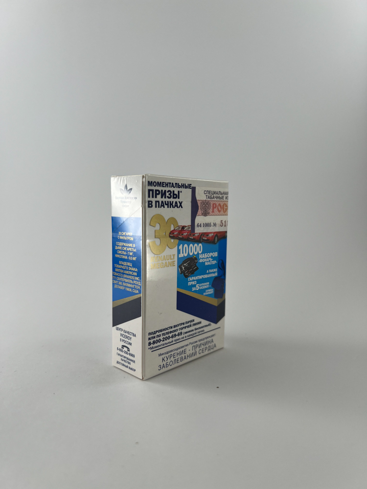 This pack of Viceroy Blue cigarettes is part of the limited edition advertising campaign „Машины в пачках!“ (English: „Cars in packs!“) held in Russia. The main design highlight is a bright image of a Renault Megane with the promise of instant prizes, 30 of which were cars. The back side shows additional information about the campaign and its prize pool (including 10,000 tool kits). The entire package is in excellent condition, with the original film and Russian excise stamp.