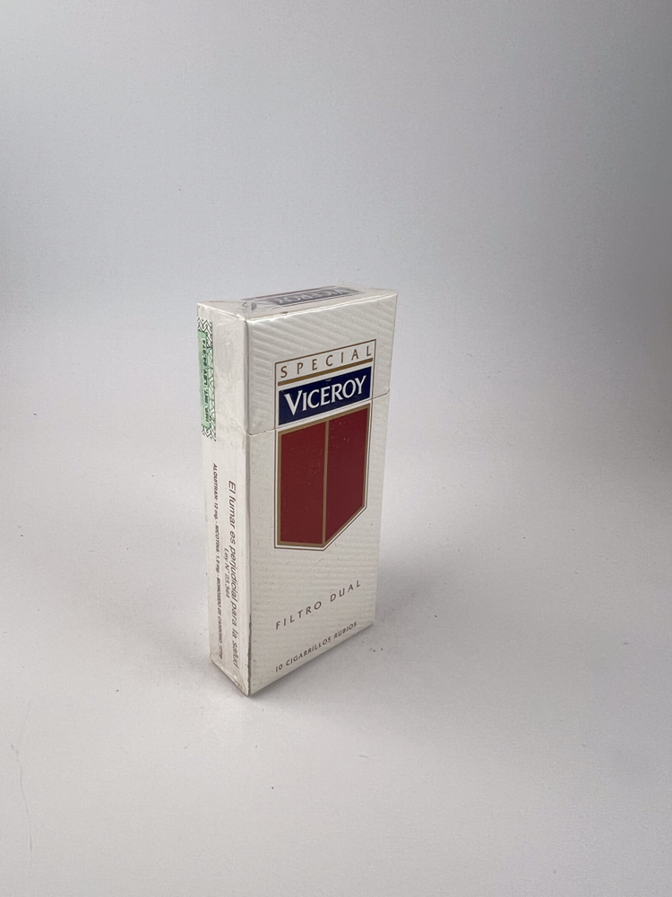 The back features a picture of the filter and an explanation of the double filter technology – a marketing element often used at the time to emphasize a „milder“ taste. Green excise stamp with instructions Code No. 34 confirms the Argentine edition. The design maintains the classic identity of the Viceroy brand - minimalist but solid.