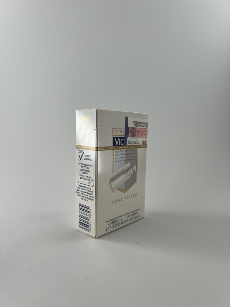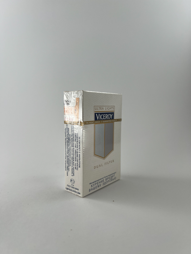Description: This pack of Viceroy Ultra Lights cigarettes is one of the variants of the classic Dual Filter series, distinguished by a soft white color and subtle gray-silver graphic elements. This is the Ultra Lights version, designed for those who preferred a lighter taste. The back of the pack features a clear image of the filtration principle, emphasizing the dual filter technology with a carbon layer. The inscriptions in English and Russian testify to the internationalized positioning of the product in the Russian market. The pack is manufactured according to the GOST 3935-2000 standard, which helps to more accurately frame the period.
