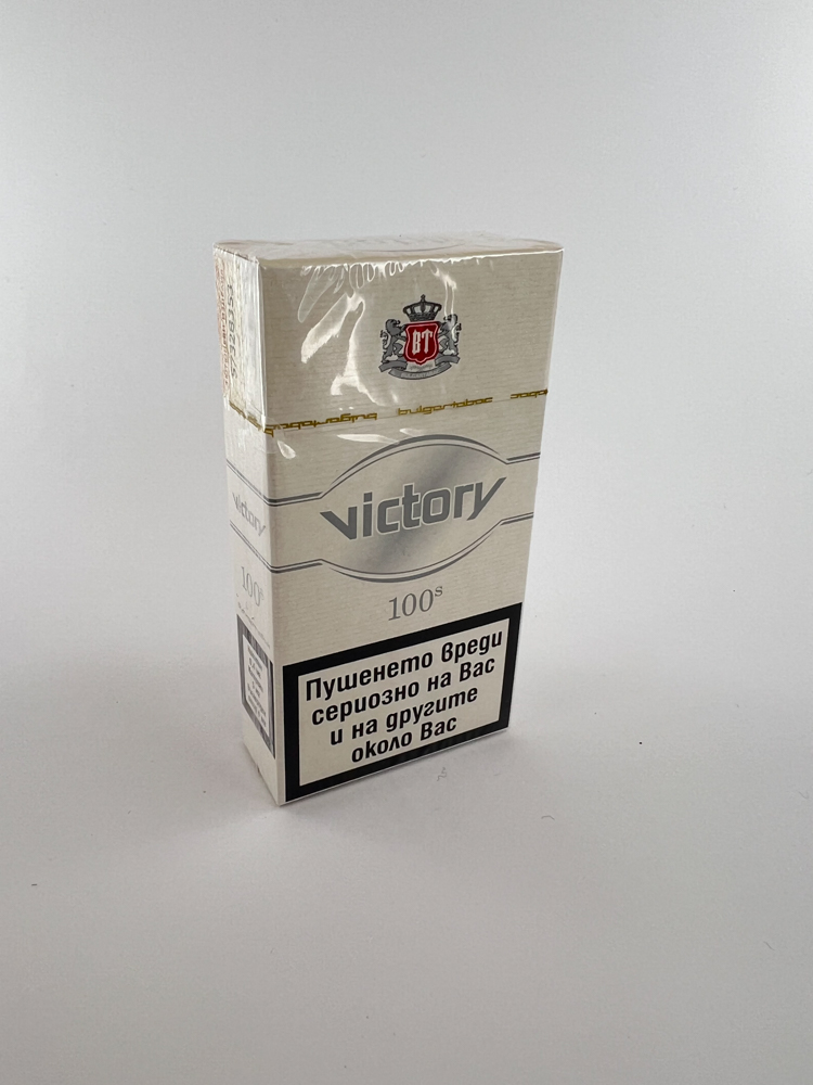 Description: This Victory 100's cigarette pack has a classic design, light beige with metallic silver elements. Above the logo is the emblem of the Bulgarian tobacco company "Bulgartabac" with the initials BT. The pack is elongated - these are 100 mm long cigarettes, which is indicated by the "100's" marking. Warnings about the harm of smoking are presented in Bulgarian, which indicates that the pack was intended for the local Bulgarian market. A state control strip with a serial number is pasted on the top.