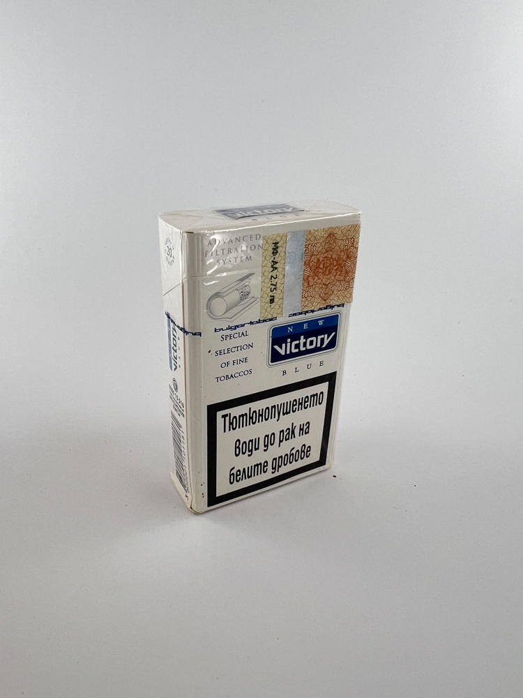 „"Victory New Blue" - a narrow format (King Size) Bulgarian cigarette pack with a charcoal filter. The design is a white bottom field with a blue top band, contrasting, bright and minimalist aesthetics. The denominations such as "New Victory Blue", "Charcoal Filter" are visible. The stamp indicates the price of 2.75 leva (~1.40 € at the time) and the signs of the Russian pack validity system.