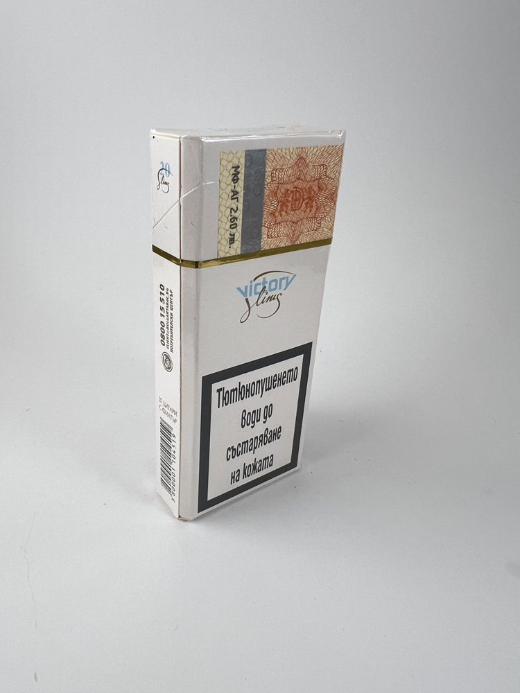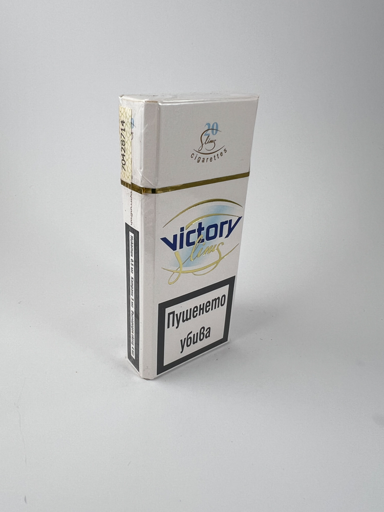 Description: Light (white/pearl) minimalist design with a thin gold band in the middle. In the center – victory slims logo and tag DELUXE. Front and back – large Bulgarian text warnings. Top – BG excise stamp; sides – barcode and technical notes. Condition – unopened, cellophane clean, corners slightly creased.