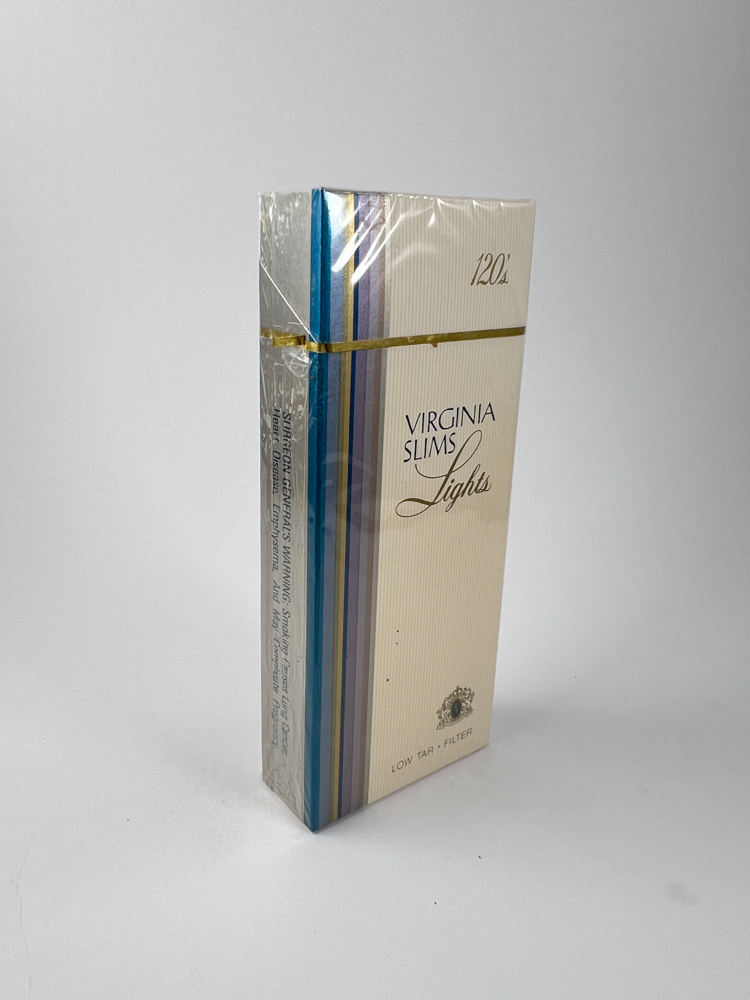 An elongated white pack with vertical stripes of blue, purple, silver and gold on the left side. At the top right – the inscription „120's’, in the center – the brand name “Virginia Slims Lights„. At the bottom the phrase “Low Tar • Filter„ is visible. This series was intended for a female audience, distinguished by its elegant design and extremely long and thin cigarette format. The pack presented – closed, with cellophane, in very good condition.