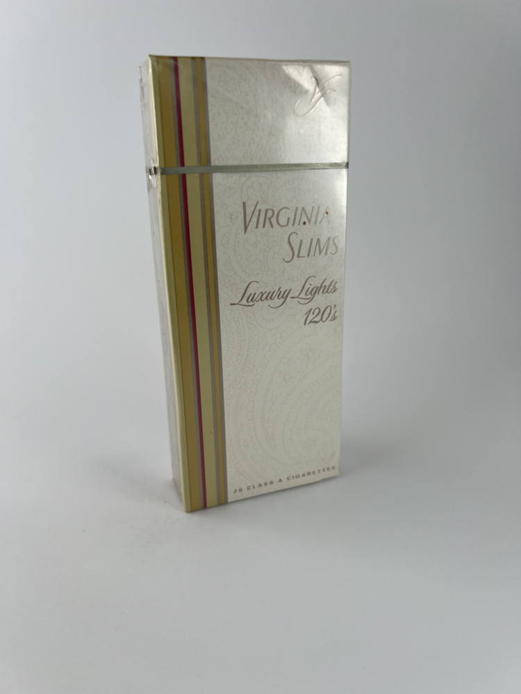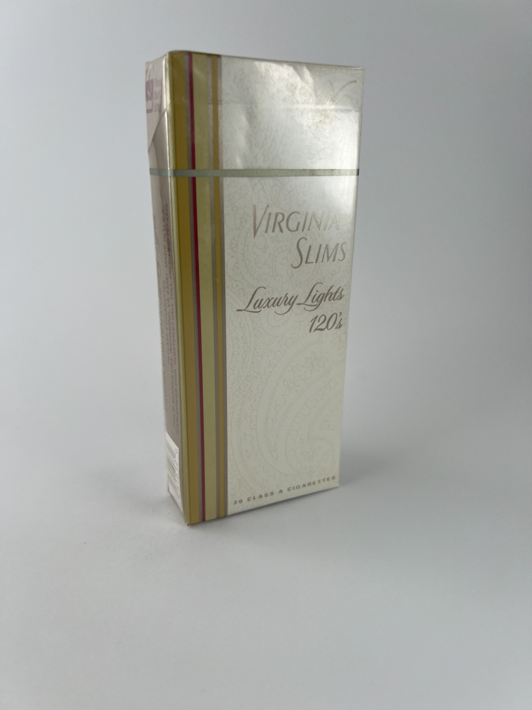 Description: This is an elegant pack of Virginia Slims Luxury Lights 120's cigarettes, distinguished by a sophisticated, white and gold design with vertical stripes. This model is designed for women who like a long cigarette format (120 mm) and a mild taste. The pack is decorated with a delicate paisley ornamentation, embodying luxury and subtlety, and the "VS" sign is raised at the top.