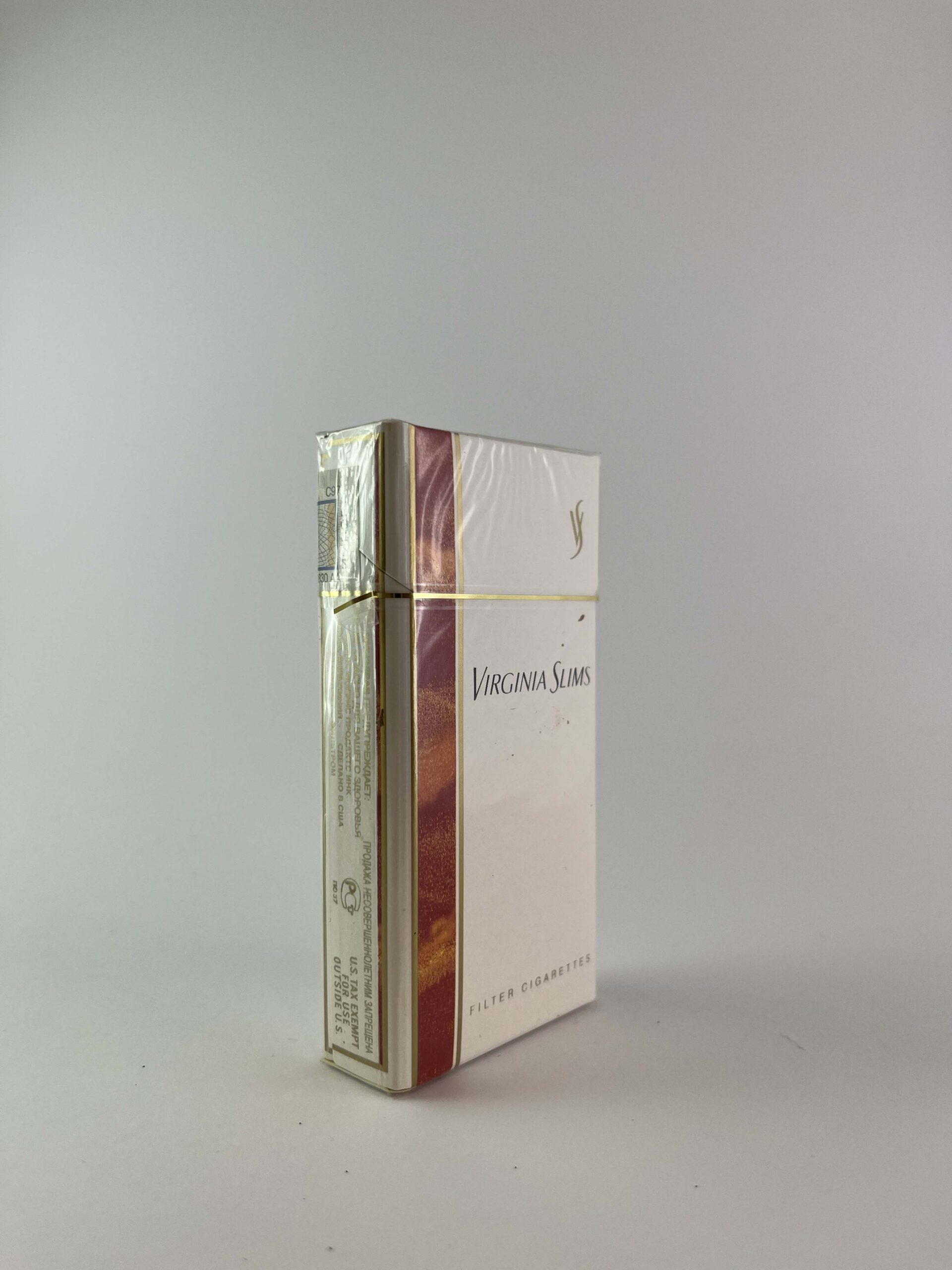 Description: The Virginia Slims cigarette pack features an elegant, minimalist design with white and red accents that convey sophistication. This brand is aimed at women and is known for its slim cigarettes that are designed to appeal to feminine tastes. The pack design is soft and subtle, without any prominent warning labels, but still communicates the health risks of smoking.