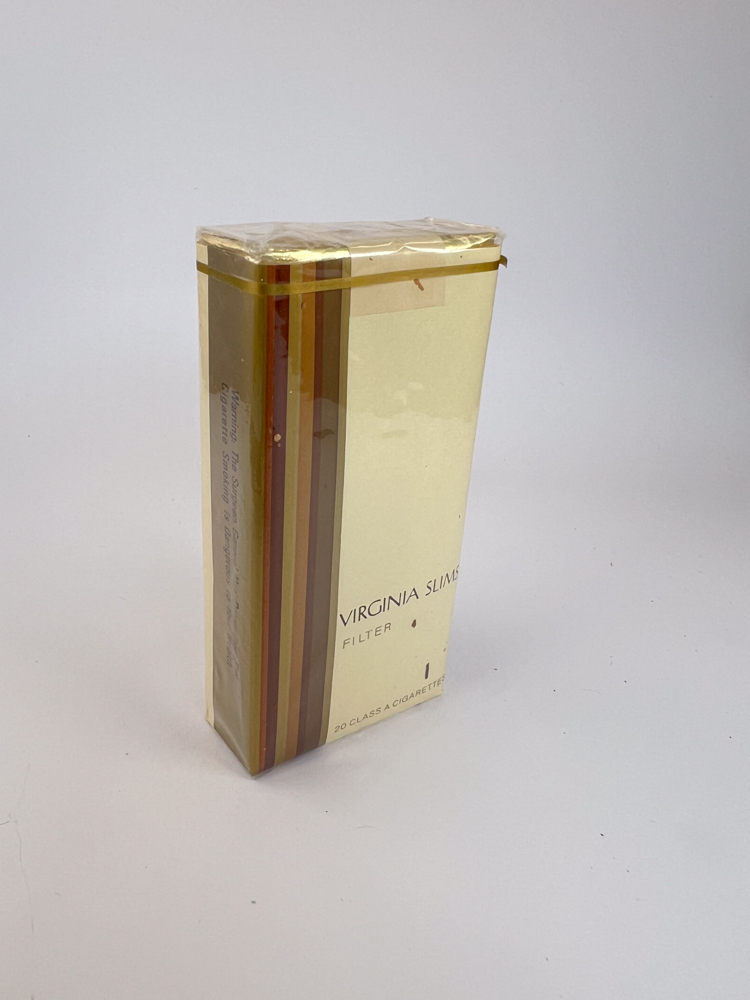„Virginia Slims Filter is one of the most iconic American cigarette brands, designed specifically for women. This pack reflects the 1980s-1990s Virginia Slims aesthetic - tall, narrow, elegant format, minimalist design and subtle color accents.