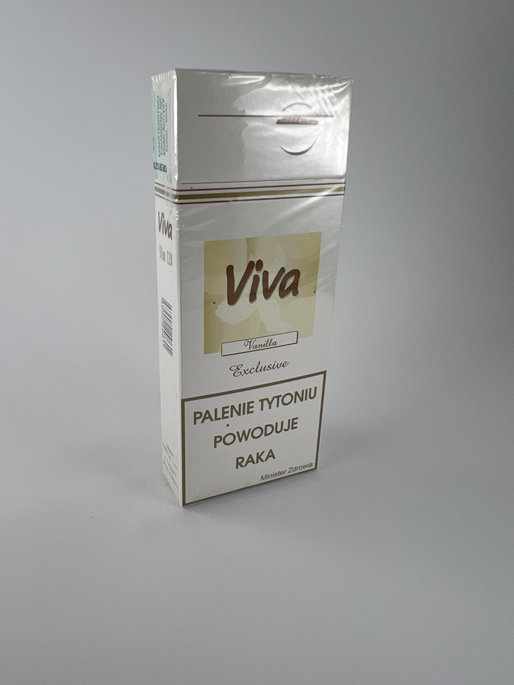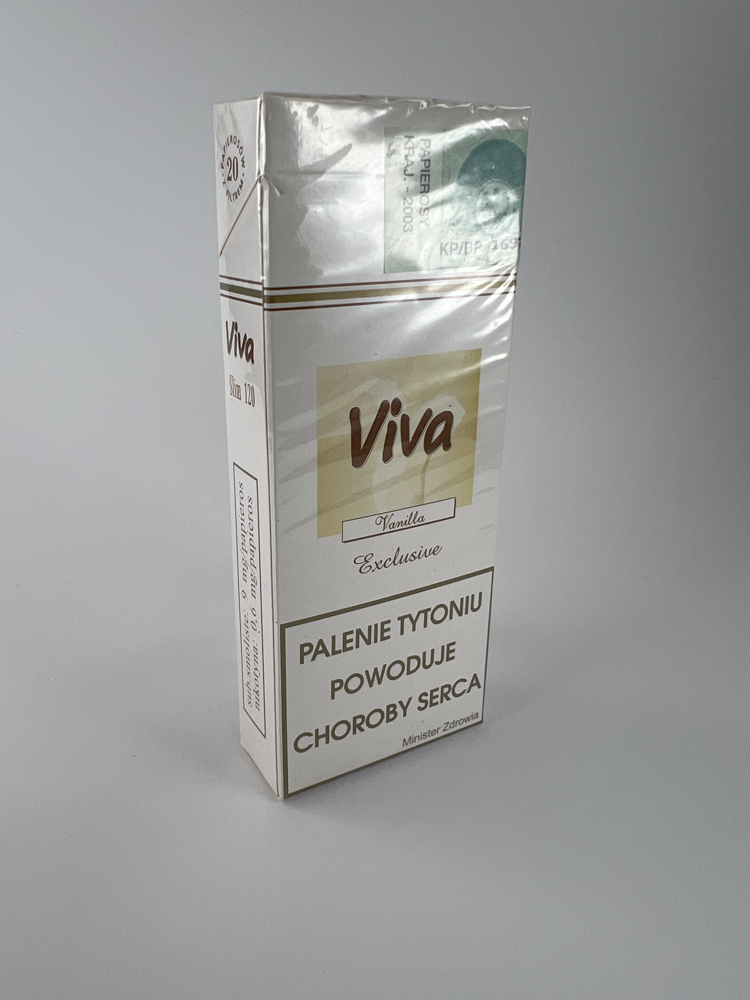 Description: This Viva "Vanilla Exclusive" cigarette pack is a Polish product aimed at a female audience. The pack is white in color, with a minimalist design, indicating the "Vanilla" flavor and the "Exclusive" positioning. Slim 120 mm long cigarettes, and the tax marking indicates the release date of 2003. The pack remains in its original packaging, undamaged.