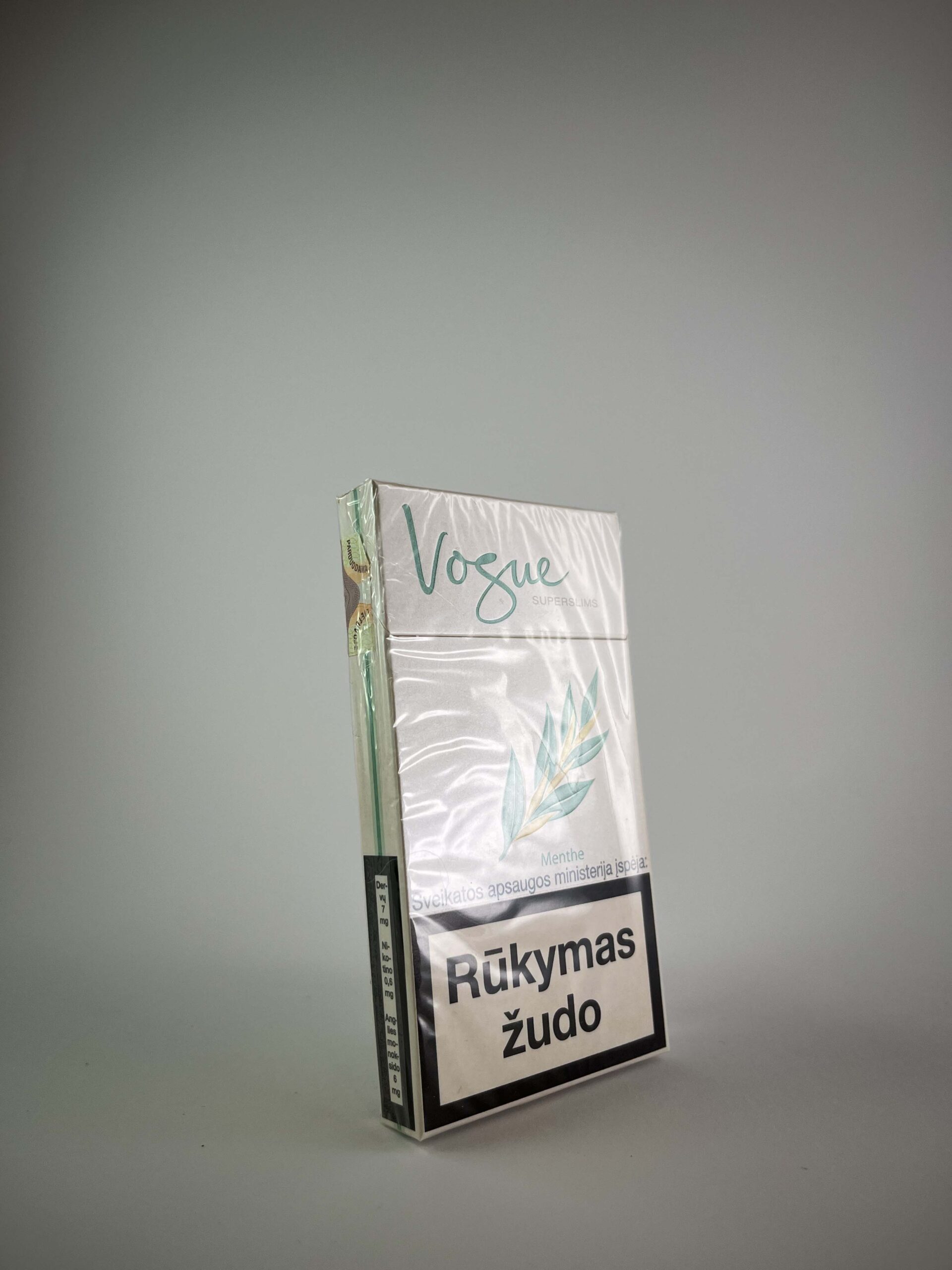 Šis Vogue cigarečių pakelis pasižymi subtiliu dizainu, skirtu moterų auditorijai. Pakuotė yra baltos spalvos su žalios spalvos logotipu ir elegantišku mėtų šakelės motyvu, kuris akcentuoja gaivų mentolio skonį. Superslims 100’s formatas pabrėžia rafinuotą ir madingą Vogue prekės ženklo įvaizdį. Pakuotė yra su lietuviškais įspėjimais apie rūkymo žalą ir kainos žymėjimu „4.80 Lt“, kas rodo, kad ji buvo parduodama Lietuvoje litų valiutos laikotarpiu.