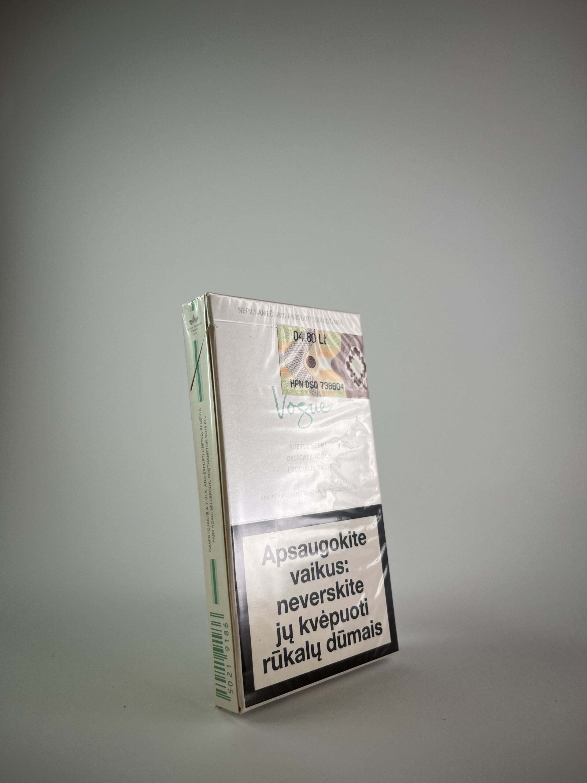 Collectible value: Vidutinė. Nors Vogue cigaretės su litų kainos žymėjimu po euro įvedimo tapo retesnės, šis pakelis nėra riboto leidimo ir neturi ypatingos istorinės vertės. Tačiau jo būklė ir specifinis mentolio dizainas suteikia tam tikros kolekcinės reikšmės.