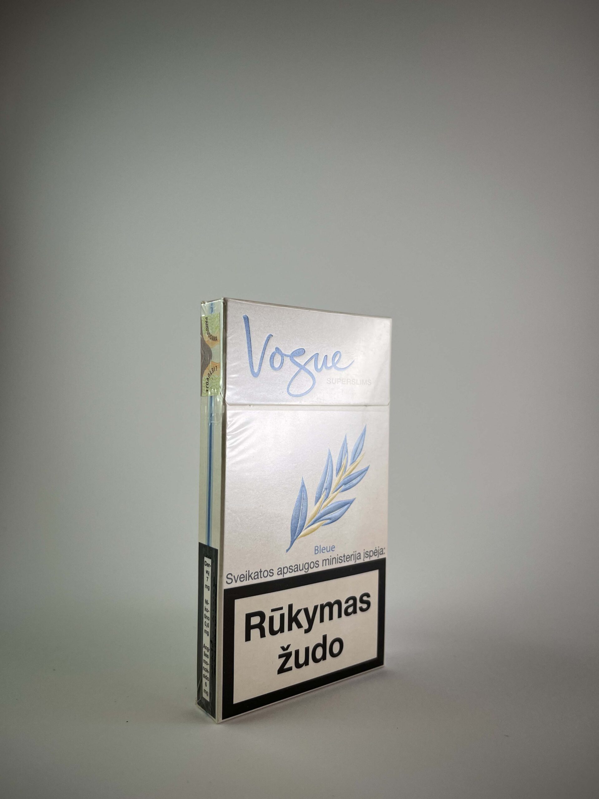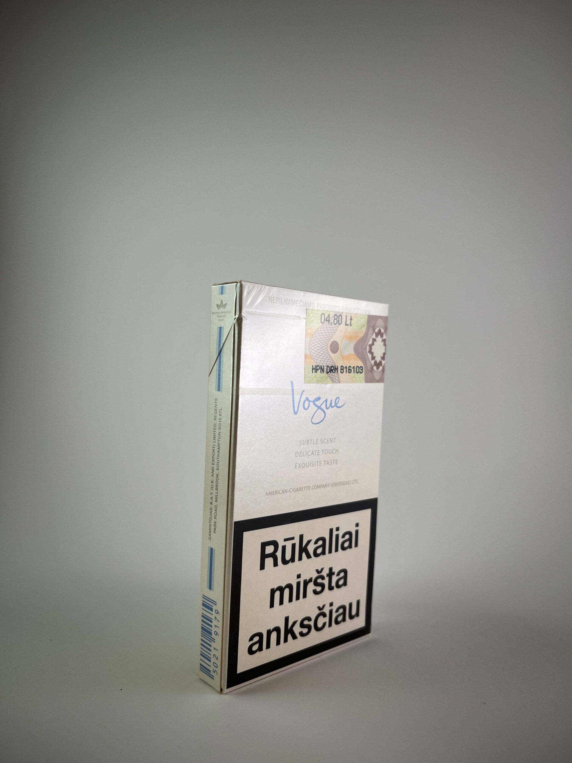 Vogue cigarettes were popular among women due to their exceptional length and thinness, especially in Eastern Europe. In Lithuania, with the litas price tag, such packs became rare and acquired a certain collector's value.