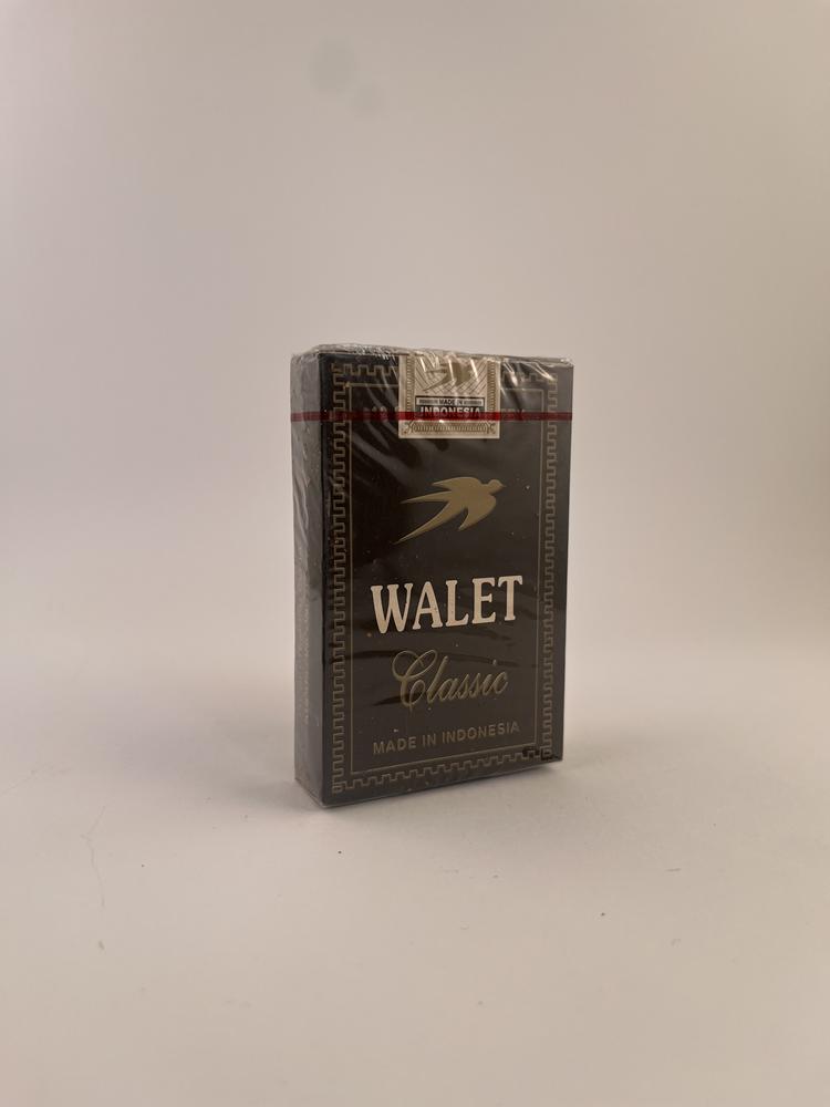Tamsaus, beveik juodo atspalvio minkštas kretek cigarečių pakelis su auksinėmis detalėmis ir minimalistiniu dizainu. Pagrindinėje pusėje – ikoniškas Wallet logotipas (stilizuota skriejanti kregždė) bei užrašas Classic, išlaikant identišką šriftų stilistiką kaip ir šviesioje versijoje. Viršuje matomas originalus akcizo lipdukas MADE IN INDONESIA su raudona juostele per visą pakelį.