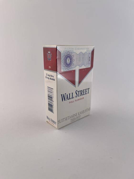 Aprašymas: Šis „Wall Street Full Flavour“ cigarečių pakelis pasižymi klasikiniu šio prekės ženklo dizainu – baltas fonas su ryškiu raudonu geometriniu „V“ formos elementu ir centriniu herbo simboliu. Dizainas primena aukštesnės klasės cigarečių stilistiką, nors pats prekės ženklas priklauso vidutiniam segmentui. Ant pakelio matomi estų kalbos įspėjimai („Suitsetamine kahjustab tervist“), taip pat Estijos akcizo banderolė, kas leidžia tiksliai identifikuoti rinką. „Full Flavour“ variantas nurodo stipresnio skonio kategoriją.