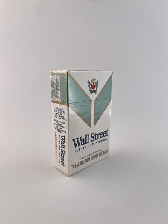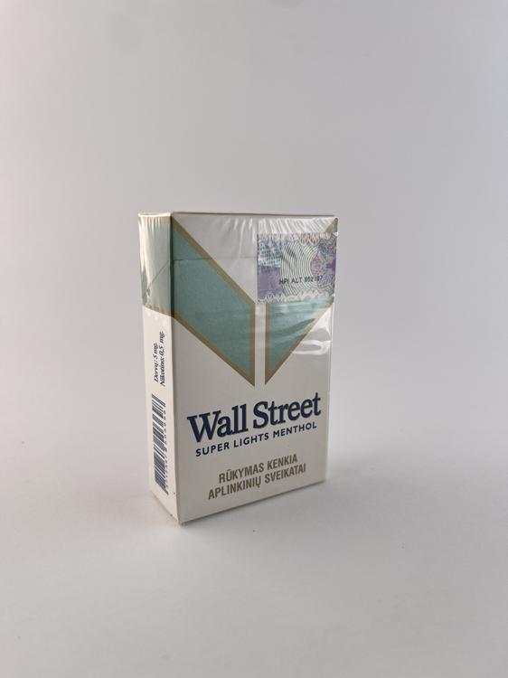 Šis „Wall Street Super Lights Menthol“ cigarečių pakelis pasižymi švariu ir elegantišku dizainu, kuriame dominuoja balta spalva su švelniu žalsvai melsvu geometriniu elementu bei aukso spalvos kontūrais. Priekinėje dalyje išlaikytas būdingas „V“ formos dizainas bei herbas, suteikiantis pakeliui atpažįstamą identitetą. „Super Lights Menthol“ žymėjimas nurodo lengvesnio mentolio segmento produktą, o spalvinė gama perteikia gaivumo ir lengvumo įspūdį. Dizainas minimalistinis, būdingas ankstyvesniam laikotarpiui prieš didelių įspėjimų dominavimą. Lietuviški įspėjimai ir senesnio tipo akcizo ženklas patvirtina vietinę rinką.
