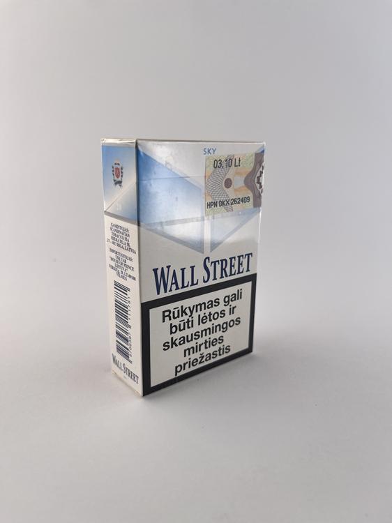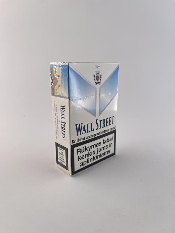 Šis „Wall Street Sky“ cigarečių pakelis išsiskiria šviesesniu ir modernesniu dizainu nei klasikinė „Super Lights“ versija. Dominuoja balta spalva su švelniu mėlynu gradientu, kuris sukuria lengvumo ir „oro“ estetiką, atitinkančią pavadinimą „Sky“. Priekinėje dalyje išlaikytas būdingas geometrinis „V“ formos elementas bei herbas viršuje, suteikiantis pakeliui vientisumo su visa „Wall Street“ linija. Dizainas minimalistinis, orientuotas į lengvesnių cigarečių segmentą, su aiškiai matomais lietuviškais sveikatos įspėjimais.