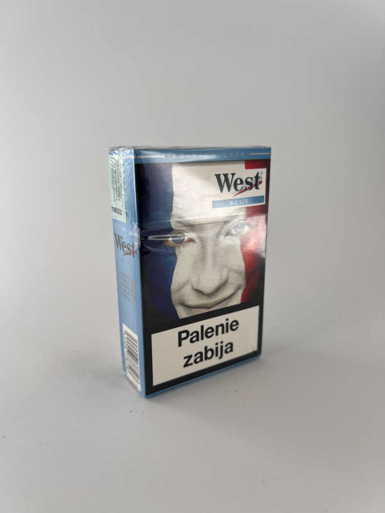 This is a special limited edition pack from West, released in 2006 to commemorate the FIFA World Cup 2006. The design depicts a human face painted in the colors of the French flag - blue, white and red. This series was released with different national flags on the faces (Italy, Germany, France, etc.) to reflect the global sporting event. The blue background and minimalist graphics are in keeping with the West Blue line style.