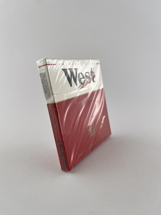 West „Full Flavor“ mini pakelis – tai mažesnio formato (10 cigarečių) variantas, kuris buvo populiarus kaip pigesnė arba „bandomoji“ alternatyva. Dizainas labai būdingas West prekės ženklui: viršuje baltas fonas su dideliu „West“ logotipu, apačioje – ryški raudona spalva, žyminti stipresnį (full flavor) variantą. Užrašas „American Blend“ pabrėžia tabako mišinį, o „Famous International Quality“ – marketinginis elementas.