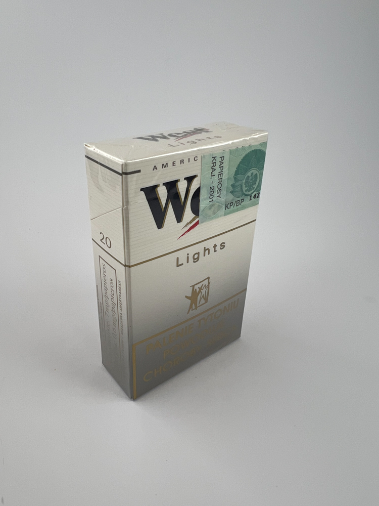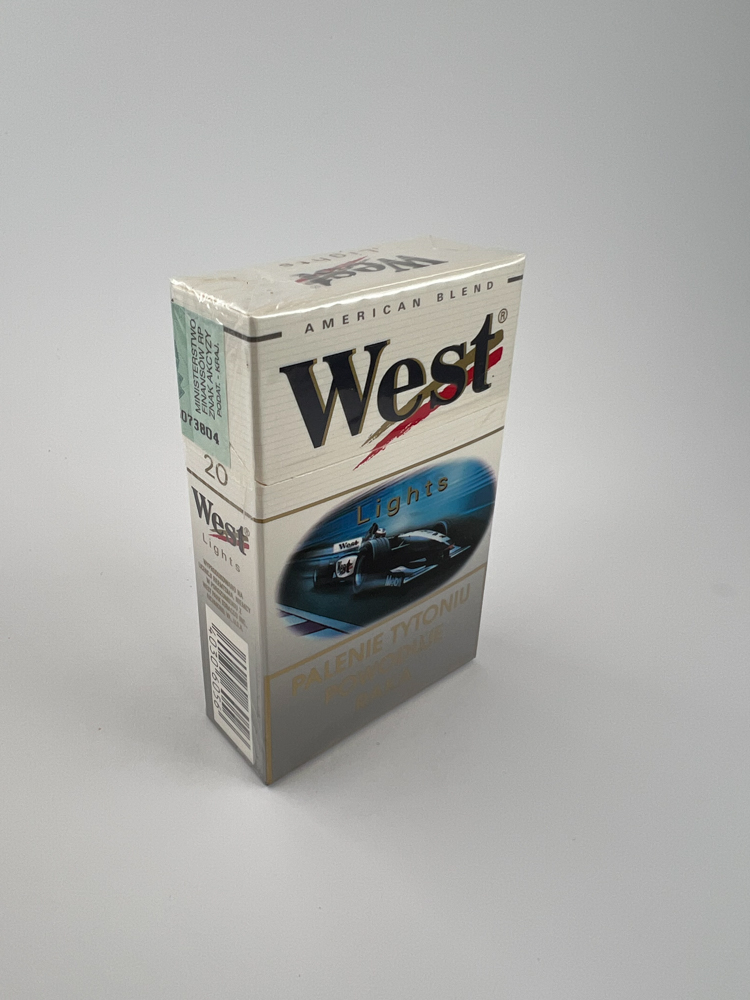 Description: This pack of West Lights cigarettes features a special Formula 1 theme – the front side features the West McLaren Mercedes car, which symbolizes one of the brand’s most prominent advertising partners in the early 2000s. The pack features the words „American Blend“ on a background that transitions from light grey to silver. The back side features a classic warning in Polish and a 2001 Polish excise stamp confirming the production date and market segment. The design is technological, dynamic and unique among the usual West releases.