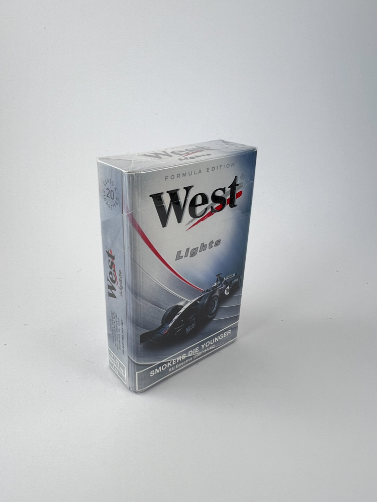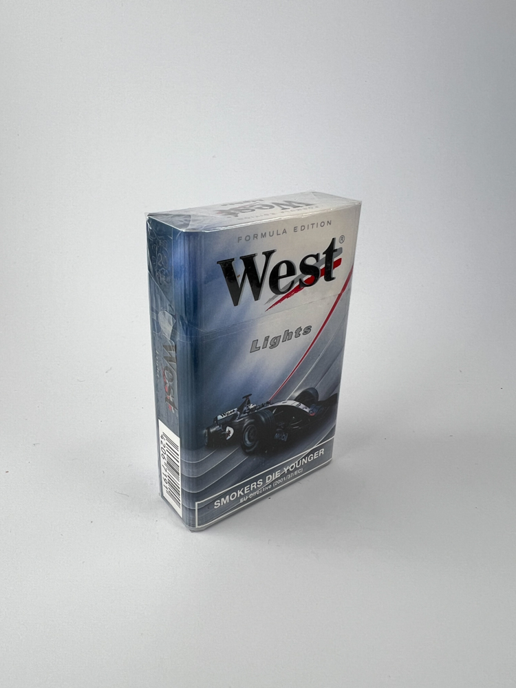 Description: This West Lights Formula Edition pack features a themed design for Formula 1 fans. The front of the pack features a McLaren-Mercedes car and the words „Formula Edition“ across the top. The background is a stylized racetrack motif, while the slogan „SMOKERS DIE YOUNGER“ refers to early EU directive labels, before the introduction of graphic labelling. The pack is intended for the Western European market (no national language labels).