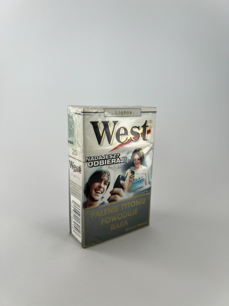 A silver-colored cigarette pack from the „West“ series with a special edition design - the front side depicts a young couple talking on the phones, along with the slogan „NADAJESZ? ODBIERAJ!” (lit. „Send? Accept!”), conveying a youthful and dynamic marketing direction. The type is indicated on the top, „Lights“ on the sides - „American Blend“. Health warnings are in Polish („Palenie tytoniu powoduje raka“ and „powoduje choroby serca“). The pack has a 2004 Polish excise stamp and a quit smoking hotline number.