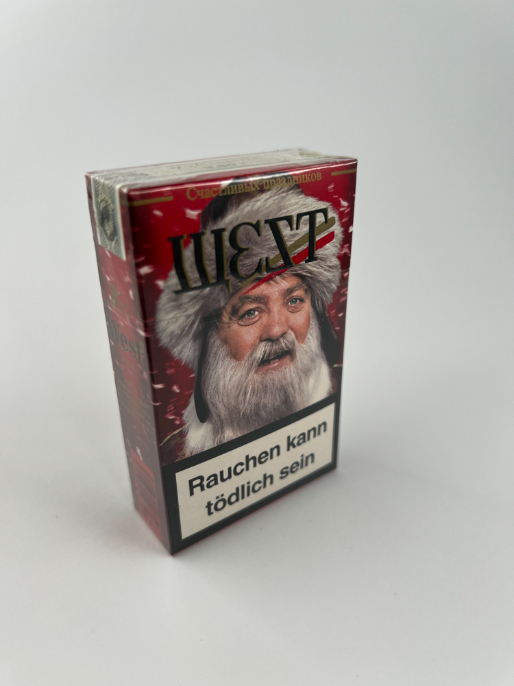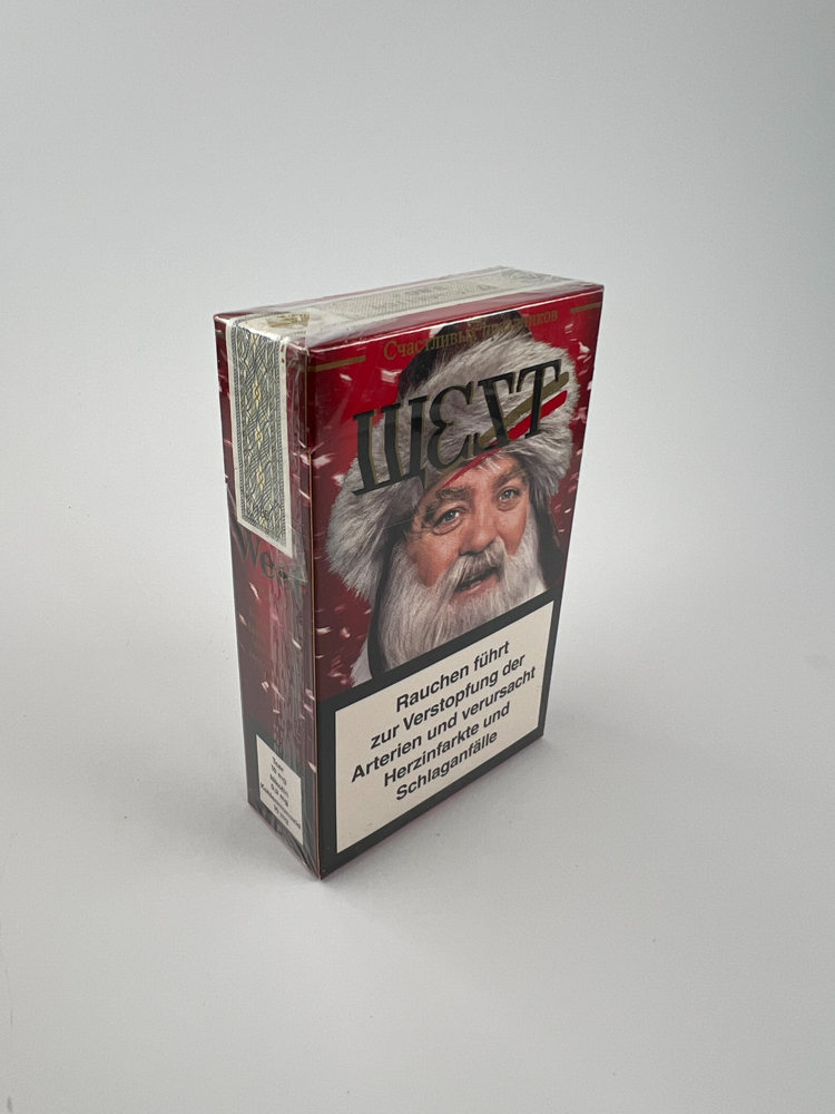 This is a special edition pack of West cigarettes, featuring a Russian Christmas design, featuring an elderly man with a white beard and a fur hat – a Russian-style interpretation of Santa Claus. The top reads „Счастливых праздников“ („Happy Holidays“), and the West brand name is written in Cyrillic – „ШЕУТ“, maintaining a Western image. The health warnings are in German, indicating that the pack was intended for export or sale within the EU.