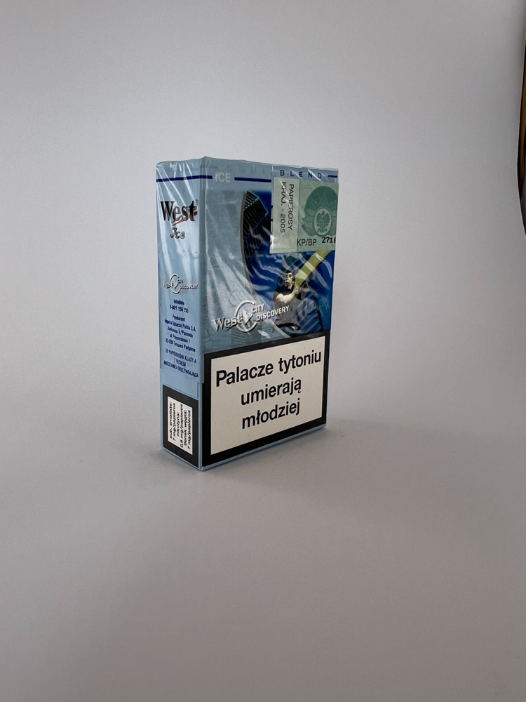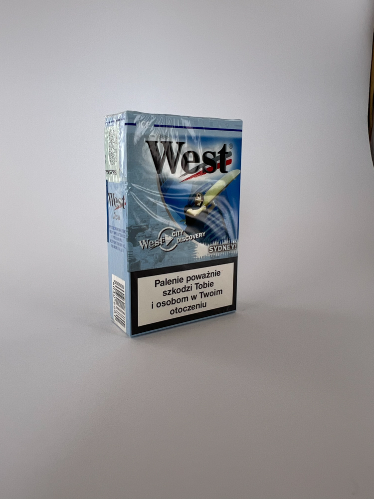 This design was part of a marketing campaign aimed at positioning West as a modern brand reflecting the rhythm of the city. On the front is a warning in Polish "Palenie poważnie szkodzi Tobie i osobok w Twymw otoczeniu" (Smoking is seriously harmful to you and those around you), and on the side is information about the manufacturer.