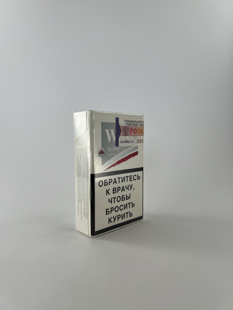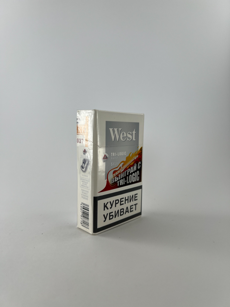 West Tri-Logic Silver is a limited edition from the well-known West brand line. The pack is distinguished by its bright design with a red Tri-Logic accent, symbolizing the three-stage filter technology. On the front is the advertising inscription „Выиграй с TRI-LOGIC“, indicating that the pack was released during an advertising campaign. Warnings about the harms of smoking are presented in large fonts on a black background, as was required in Russia at that time. On top is an authentic Russian excise sticker.