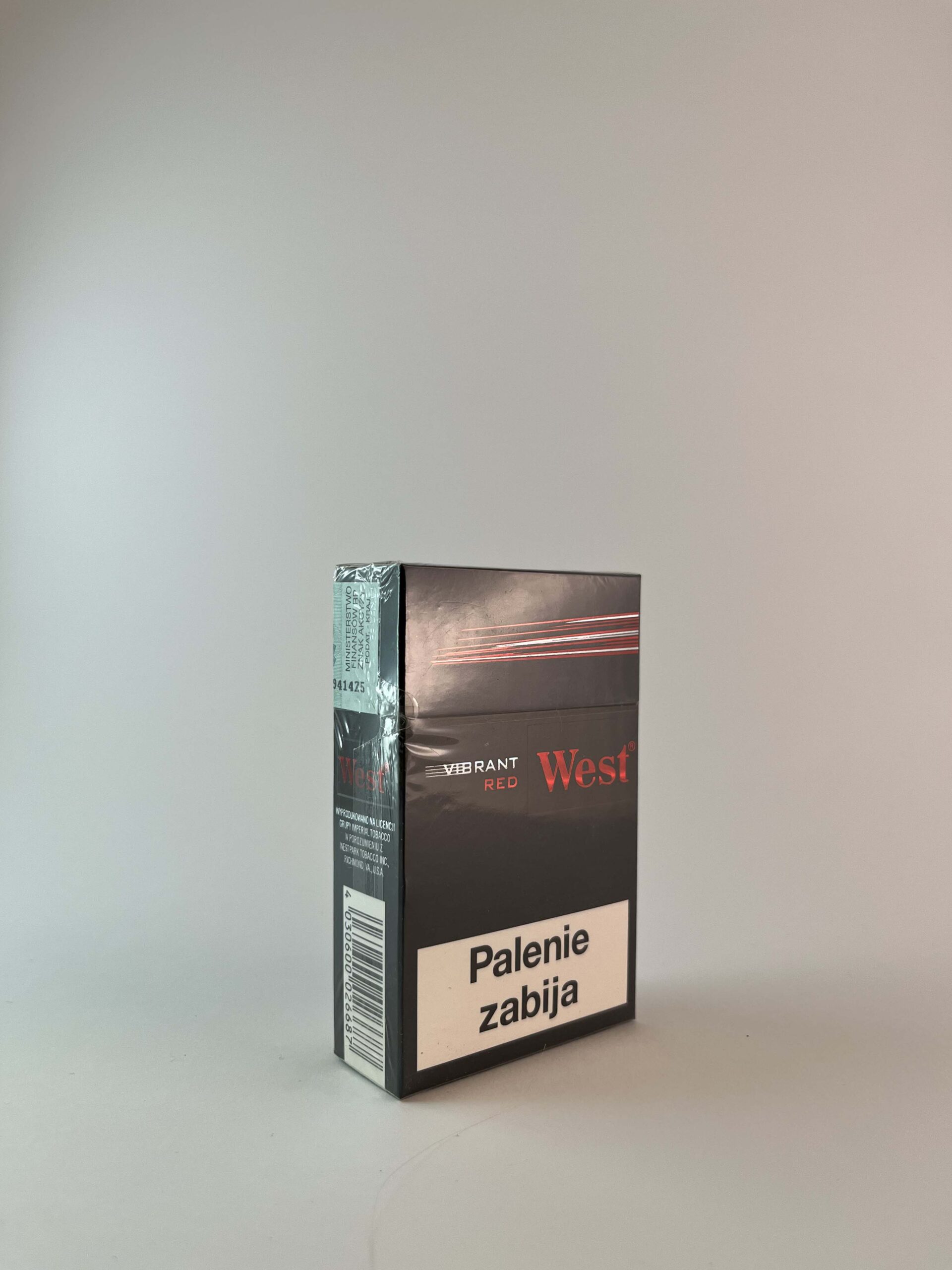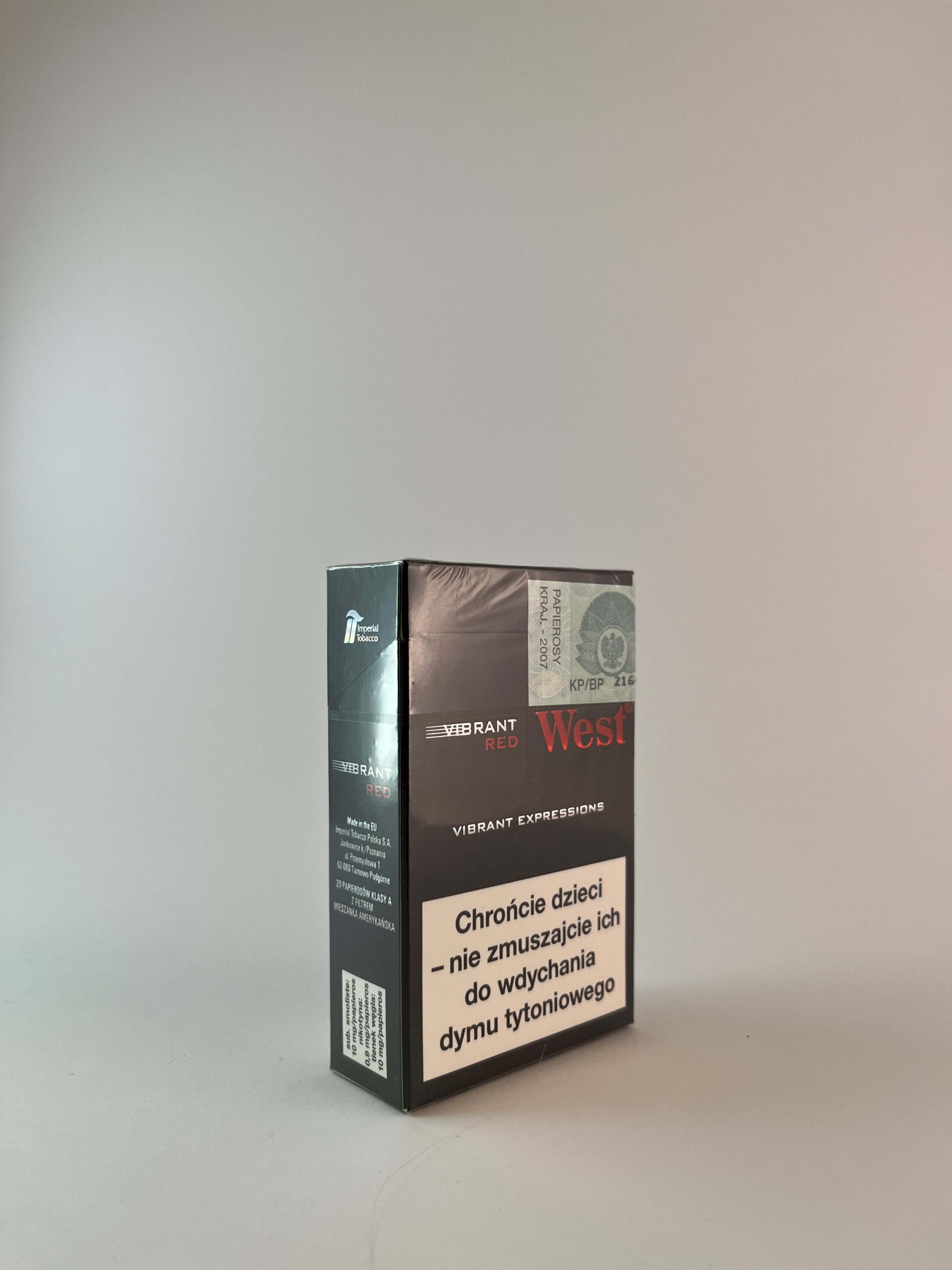 This is a modern West series pack "Vibrant Red", marked with an additional marking "Vibrant Expressions". The design is intense - a dark background with a bright red line and logo. Visually, the pack conveys the impression of a stronger taste, oriented towards an older audience. Warnings in Polish indicate that this was a product for the Polish domestic market. Condition - impeccable: the pack is undamaged, with the original foil and excise sticker.