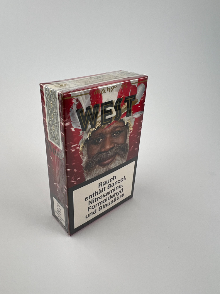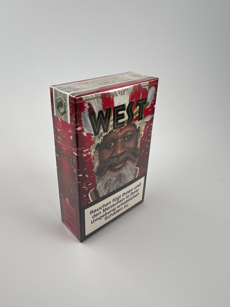 This is a special festive pack of West cigarettes, featuring a black man with a white beard and a red feathered headdress – a unique interpretation of Santa Claus. Above the logo, letters in Ethiopian script can be seen, suggesting that the pack was tailored to a specific market segment or thematic edition. The warnings about the dangers of smoking are in German, indicating that the pack was intended for the EU market. The design is colorful, unexpected and stands out from the usual West packaging.