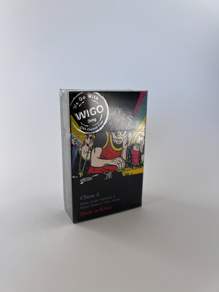Description: This pack of WIGO cigarettes features a very bright and unconventional design, featuring an animated party scene with DJs and dancers – a clear attempt to appeal to a younger audience. The top part of the pack reads „Here WIGO“ and the other side reads „We Go With WIGO – 3mg DNA Charcoal Filter“. This version of the cigarette uses an activated charcoal filter, which was common in some products for the Asian market. The pack clearly states „Made in Korea“ – manufactured under license from Woori Tobacco Corp.