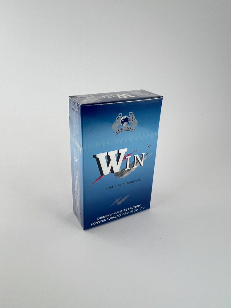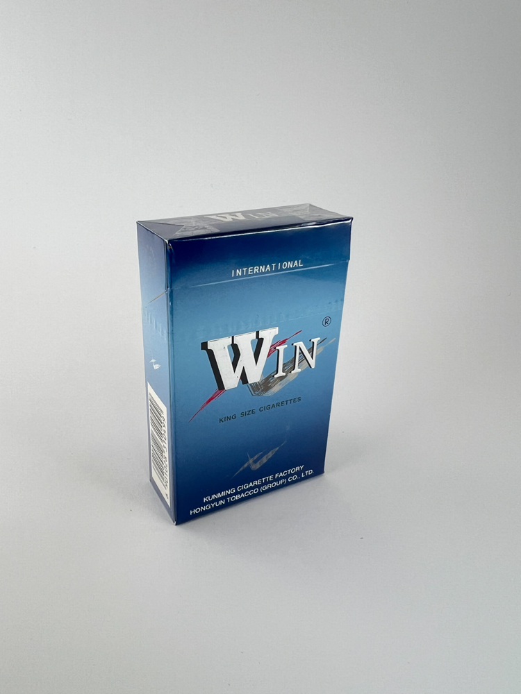 Description: This pack of Win cigarettes features a bright blue color, a large logo, and the English inscription "International" - it appears to be intended for export markets. The packaging is of good quality, with no visible damage and with all warning texts.