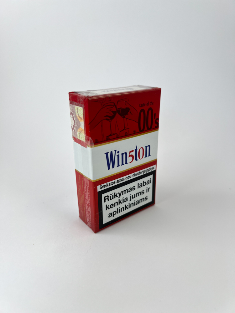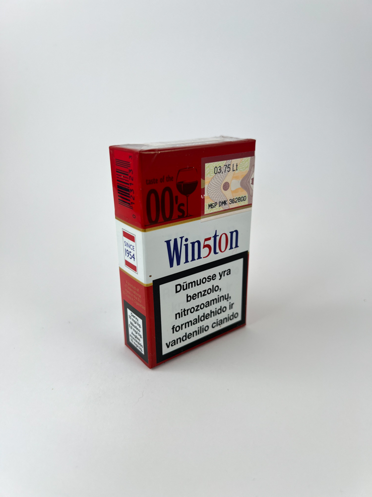 Description: Tai yra dar viena „Win5ton 00’s“ leidimo versija, šį kartą su raudonu viršumi. Viršutinėje dalyje vaizduojamos rankos su taurėmis ir užrašas „taste of the 00’s“, o tai sukuria vakarėlio ar šventinės nuotaikos įspūdį. Vidurinėje dalyje – „Win5ton“ logotipas su stilizuota raide „5“, o apačioje pateikti lietuviški įspėjimai apie rūkymo žalą. Gale nurodytas kainos lipdukas – 3.75 Lt – ir akcizo ženklas rodo, kad šis pakelis skirtas Lietuvos rinkai iki 2015 m.