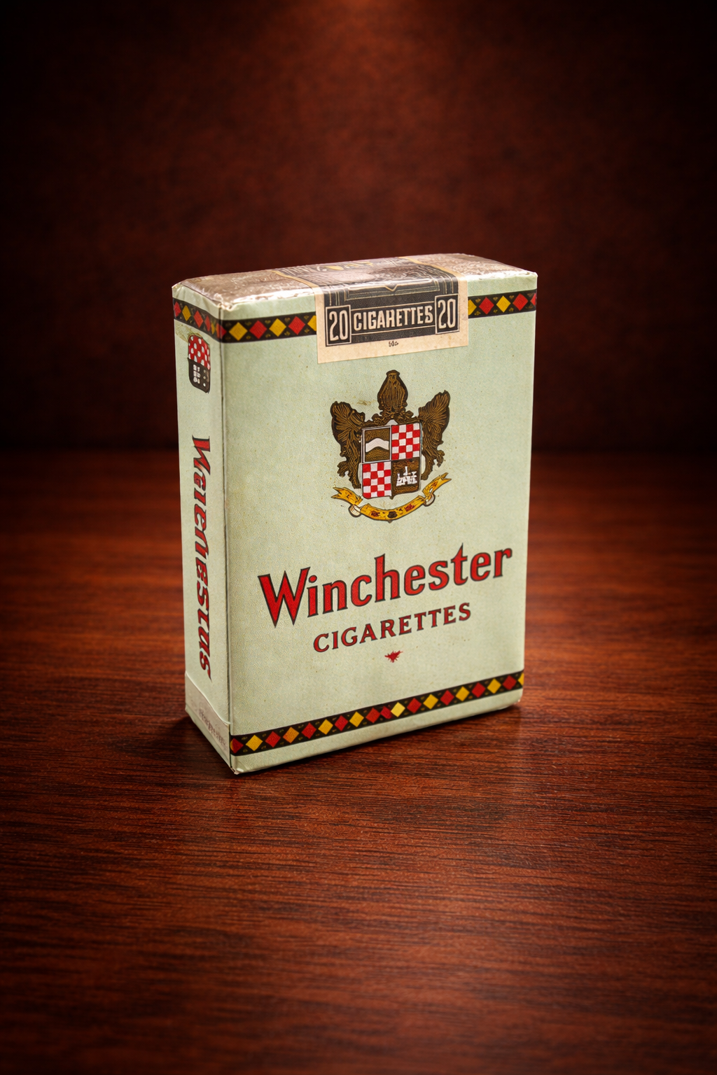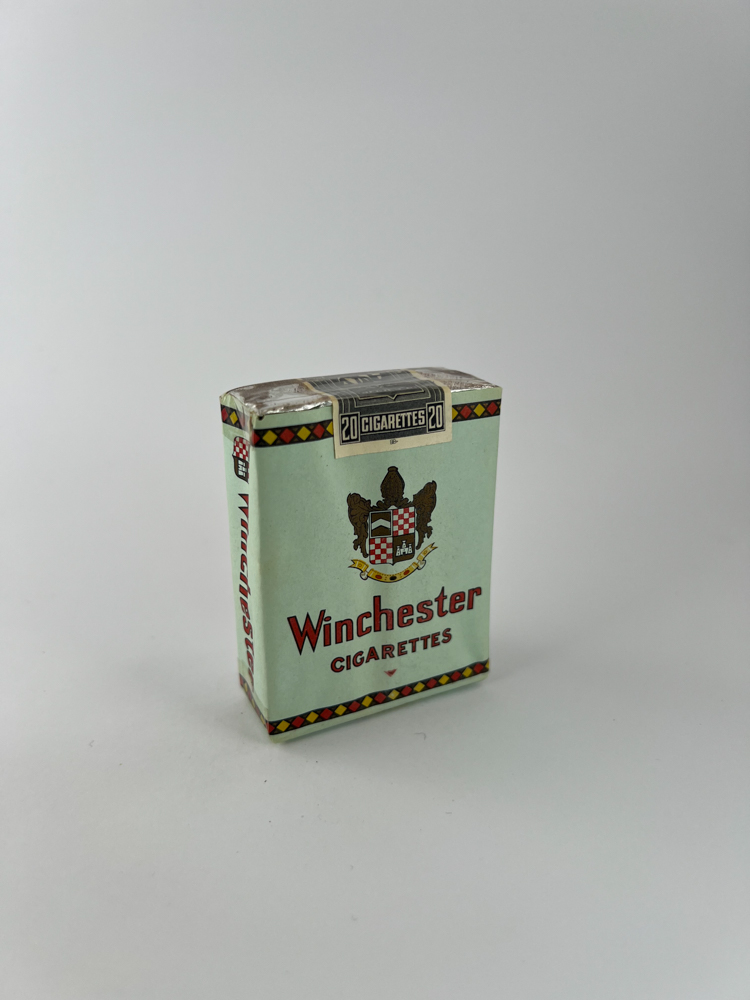 Description: This vintage Winchester Cigarettes pack was produced by the Imperial Tobacco Company of Canada and is a fine example of mid-20th century tobacco design. The light green background with heraldic elements and a decorative band at the top and bottom conveys solidity. The text on the back emphasizes the quality of the tobacco blend (Virginia, Burley, Turkish), a marketing style typical of the period. Packs from this edition have remained extremely rare and are often prized among North American collectors.
