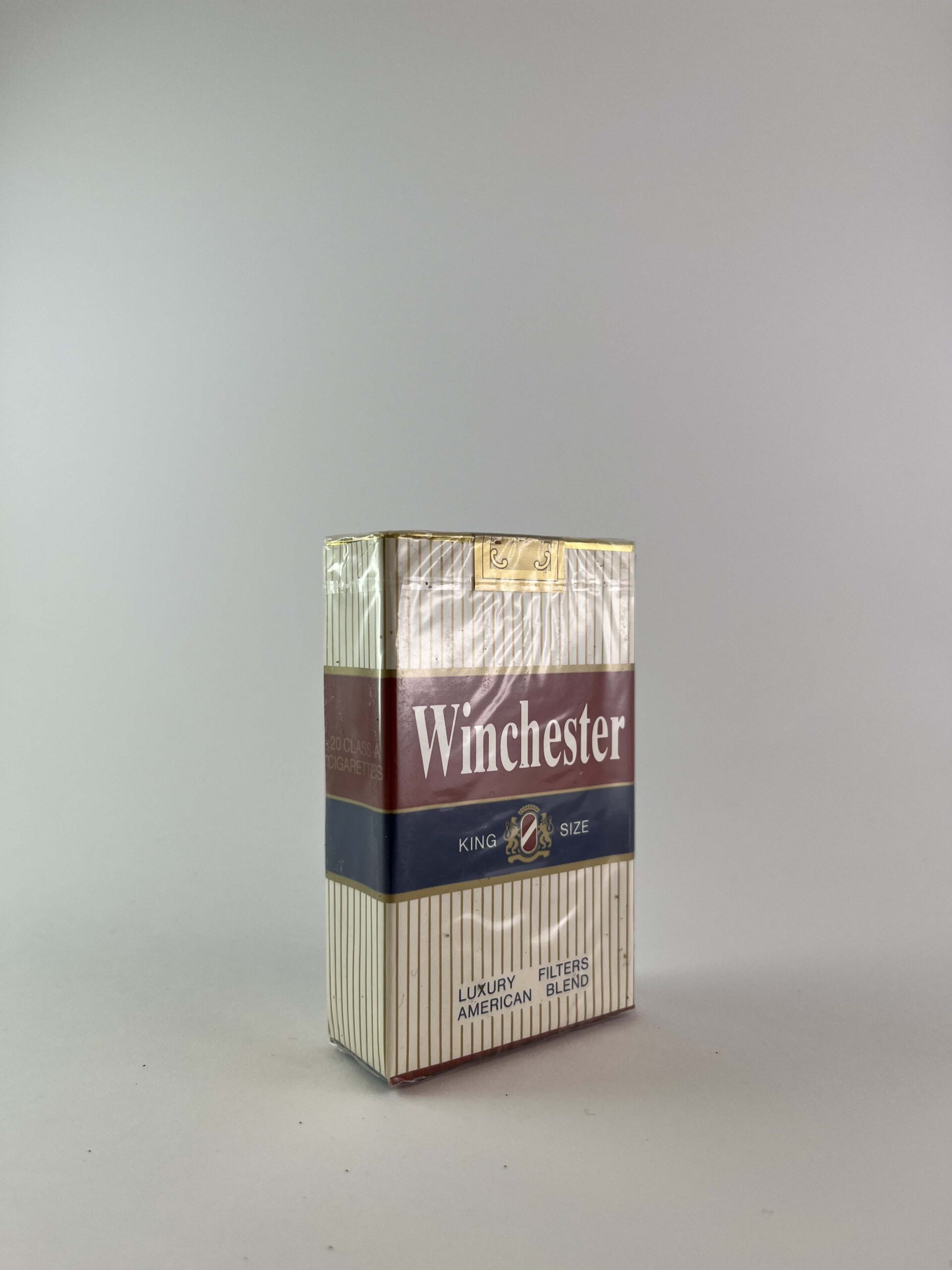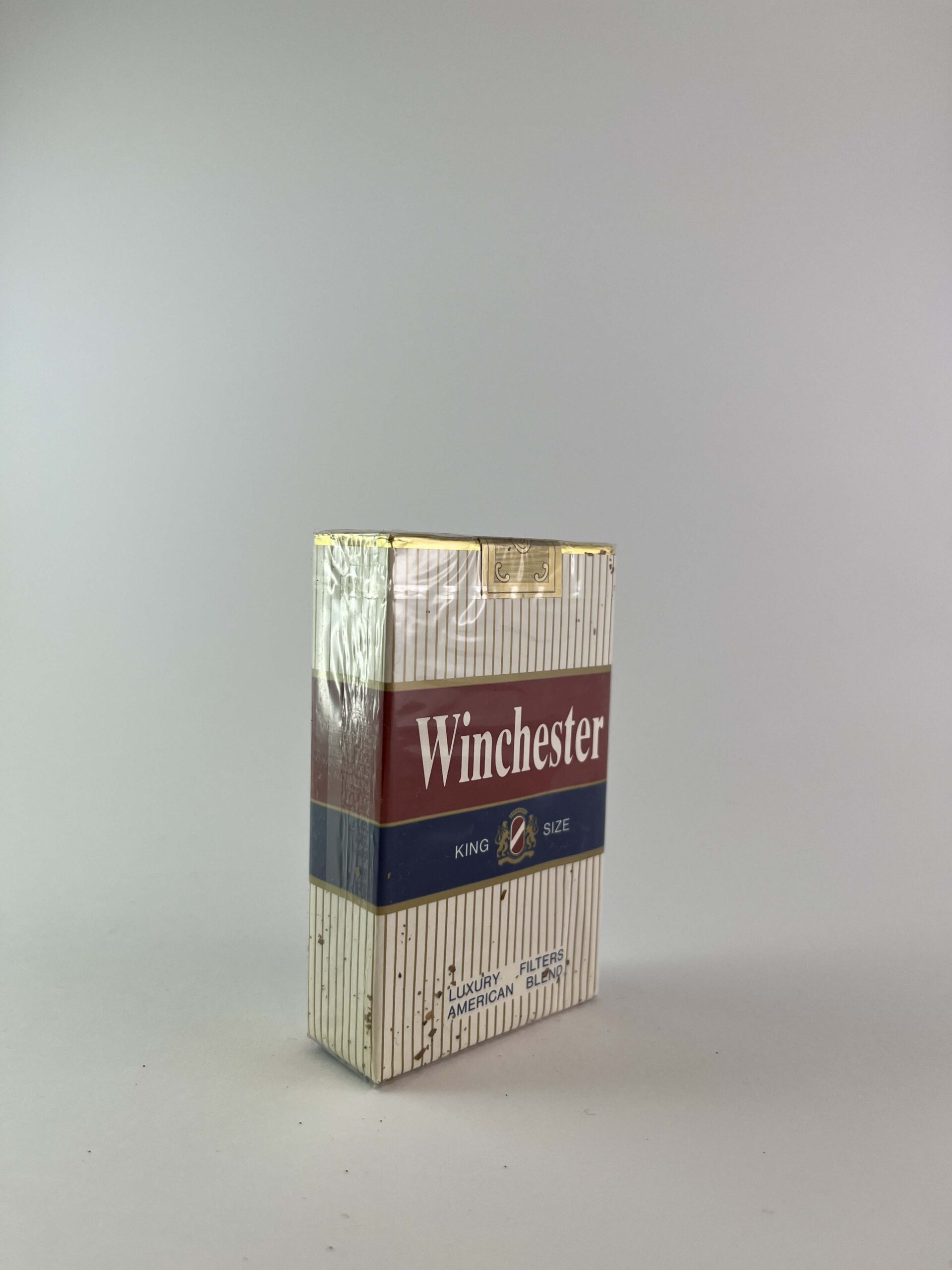 Description: This Winchester cigarette pack has a luxurious look, featuring an elegant design with vertical lines that highlight the „Luxury American Filters Blend” inscription. The red and blue colors give the pack a distinctive look, while the gold details complement the overall aesthetic. The health warning is subtly displayed, yet clearly visible.