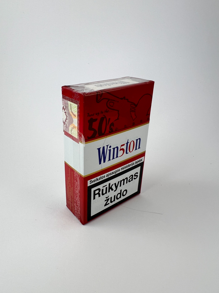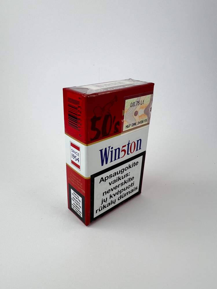 Description: Šis Winston 50’s Edition cigarečių pakelis yra specialus dizaino leidimas, sukurtas paminėti 1950-ųjų stilistiką – tai matyti iš grafikos viršutinėje pakelio dalyje ir užrašo „Tune up to the 50’s“. Spalvinė gama išlaiko klasikinį Winston stilių su raudona ir balta, o pakuotė pažymėta lietuviškais įspėjimais ir akciziniu ženklu su kaina – 3,75 Lt.