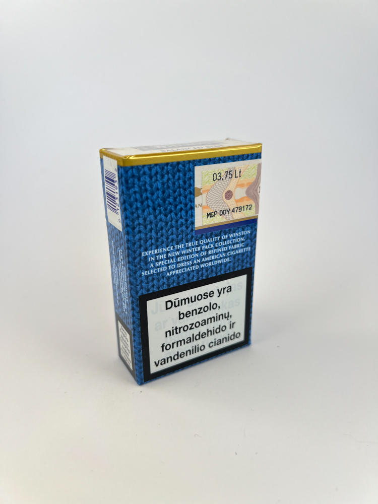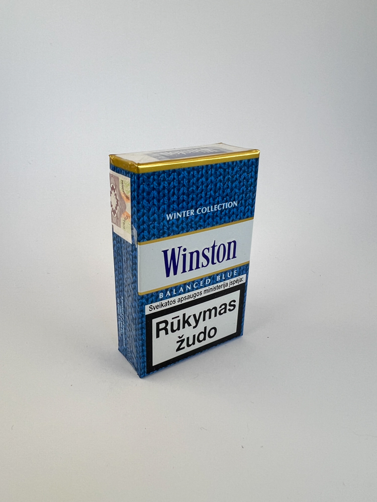 Tai riboto leidimo Winston „Balanced Blue“ cigarečių pakelis, priklausantis „Winter Collection“ serijai. Pakelis dekoruotas megztinio rašto tekstūra, o viršutinė jo dalis išskirtinai padabinta aukso spalvos apvadu. Cigarečių dizainas perteikia šilumos ir žiemos tematiką, kas tuo metu buvo populiari marketingo tendencija. Įspėjimai pateikti lietuvių kalba, nurodanti originalią rinką. Šis leidimas buvo orientuotas į estetinį ir sezonišką vartotojo patrauklumą.