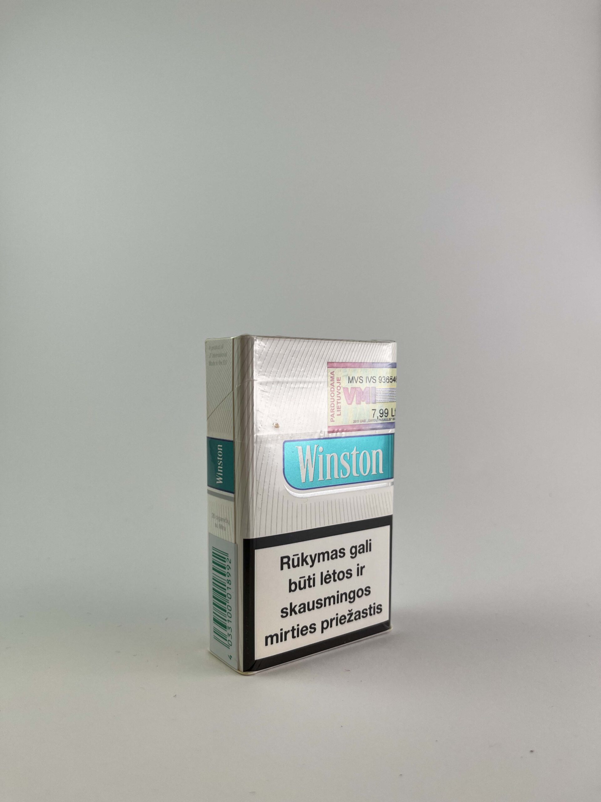 Description: Šis „Winston Blue“ cigarečių pakelis yra klasikinio dizaino, su mėlyna ir balta spalvų schema bei užrašu „American Flavor“, žyminčiu švelnesnį skonį. Pakelio priekyje ir gale pateikiamos įspėjamosios žinutės apie rūkymo pavojus sveikatai. Dešinėje pusėje yra Lietuvos banderolė, nurodanti kainą litais, kas rodo, kad pakelis buvo skirtas Lietuvos rinkai iki euro įvedimo.