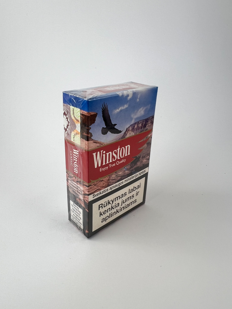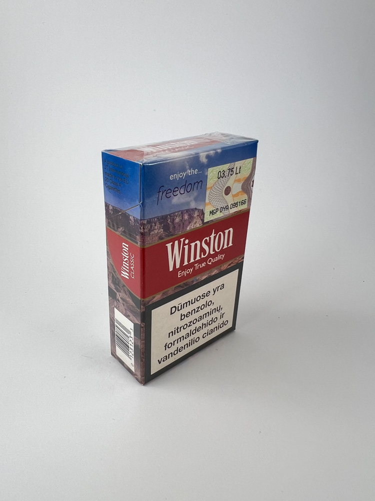 Description: Šis Winston Classic cigarečių pakelis išsiskiria charakteringu peizažu su kalnais ir skrendančiu ereliu, simbolizuojančiu laisvę – šią žinutę dar labiau pabrėžia viršuje esantis šūkis „Enjoy the… freedom“. Raudona ir mėlyna spalvos dominuoja pakuotėje, kuri taip pat turi baltą Winston logotipą bei frazę „Enjoy True Quality“. Lietuviška akcizo banderolė su 3.75 Lt kaina rodo pakelio priklausymą ankstyvajam XXI a. laikotarpiui. Įspėjimai apie rūkymo žalą pateikti lietuvių kalba trijose skirtingose pusėse, o tai patvirtina, kad pakelis skirtas Lietuvos rinkai.