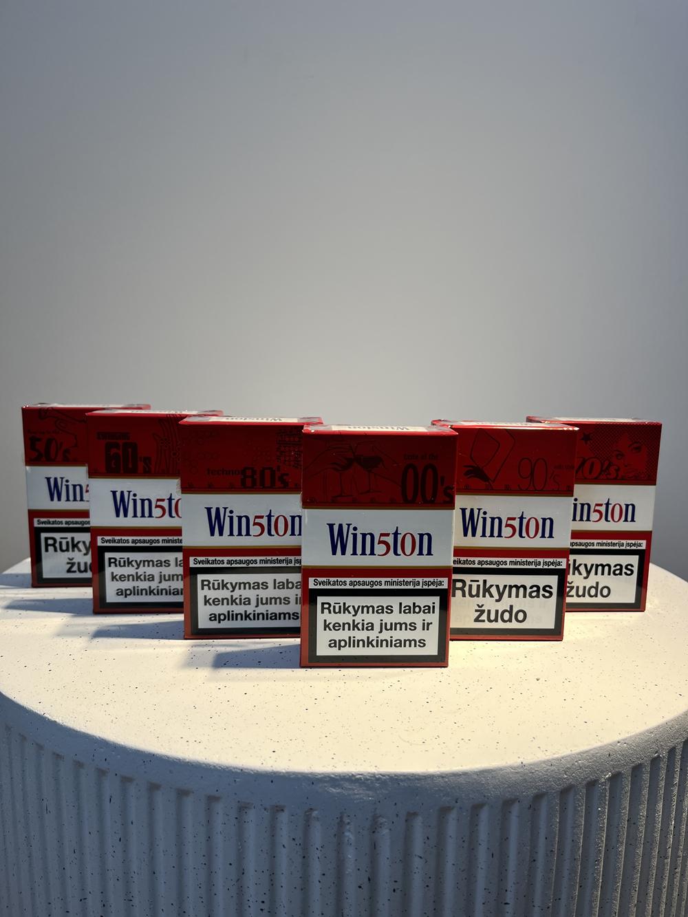 This Winston set stands out because it features a complete chronological series of designs spanning different decades, from the 1950s to the 2000s. Each pack is labeled with a specific period ("50's", "60's", "70's", "80's", "90's", "00's") and features graphic elements typical of that era.